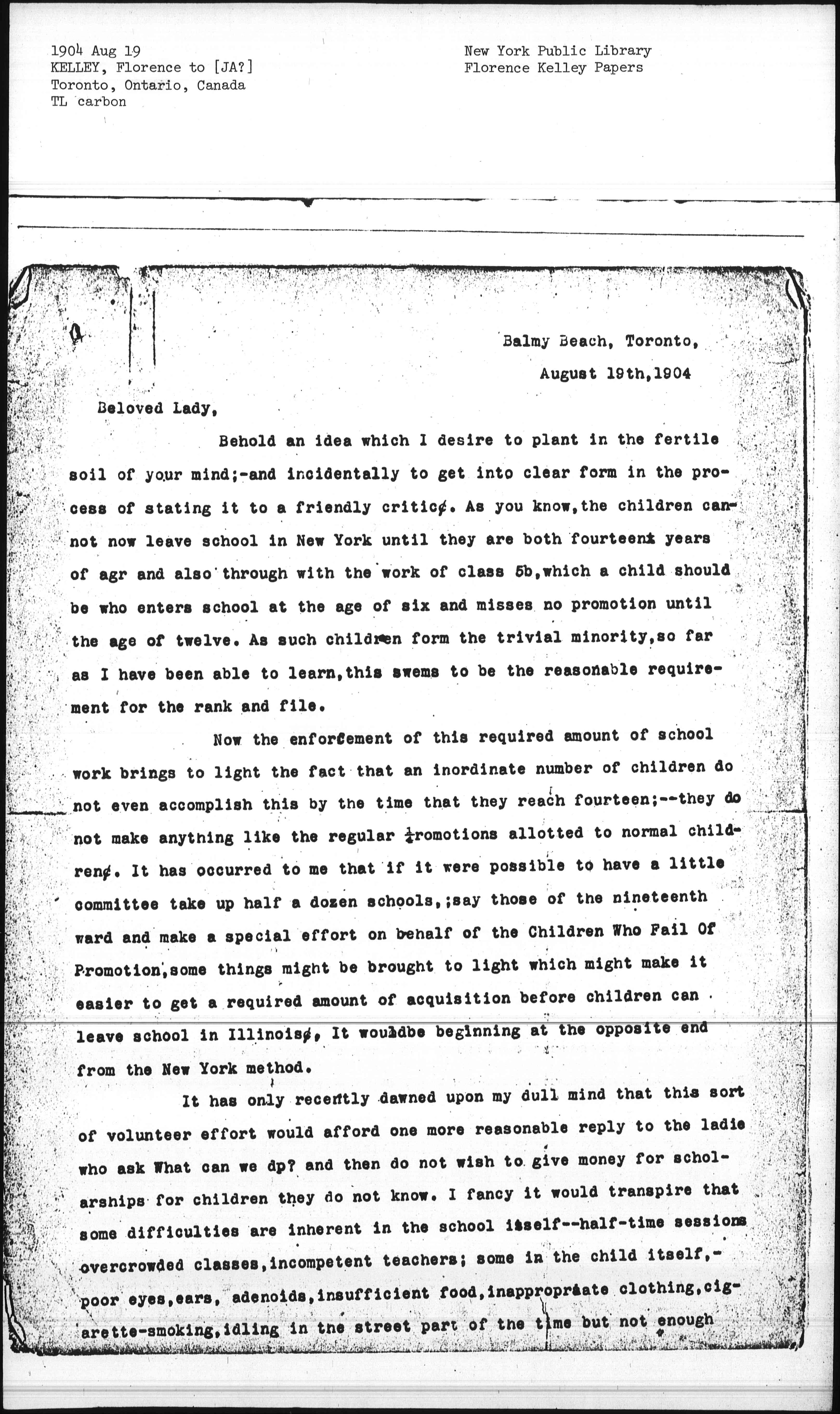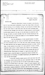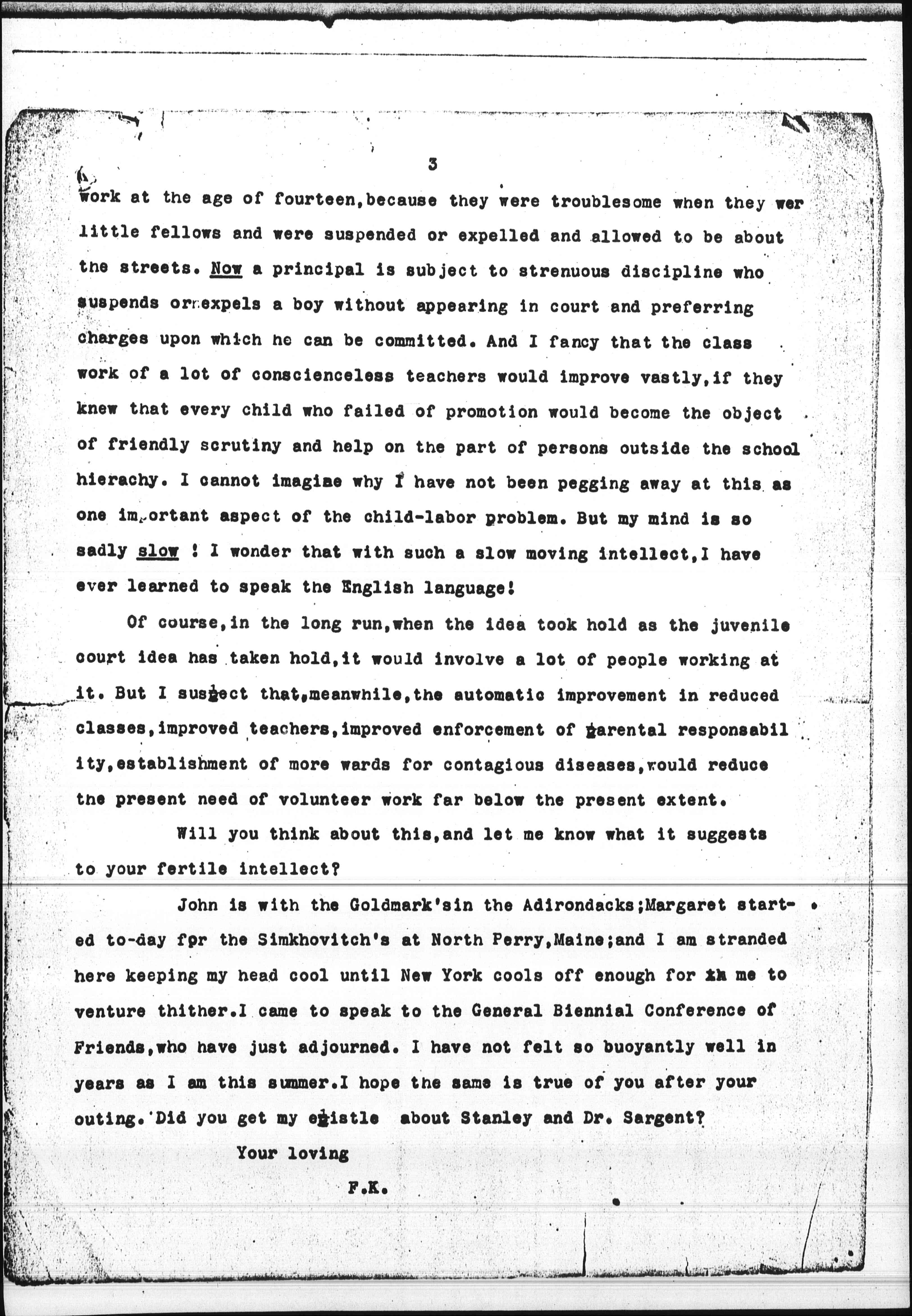 It has come to light in New York that a lot of boys cannot go to [page 3] work at the age of fourteen, because they were troublesome when they were little fellows and were suspended or expelled and allowed to be about the streets. Now a principal is subject to strenuous discipline who suspends or expels a boy without appearing in court and preferring charges upon which he can be committed. And I fancy that the class work of a lot of conscienceless teachers would improve vastly, if they knew that every child who failed of promotion would become the object of friendly scrutiny and help on the part of persons outside the school hierarchy. I cannot imagine why I have not been pegging away at this as one important aspect of the child-labor problem. But my mind is so sadly slow! I wonder that with such a slow moving intellect, I have ever learned to speak the English language.