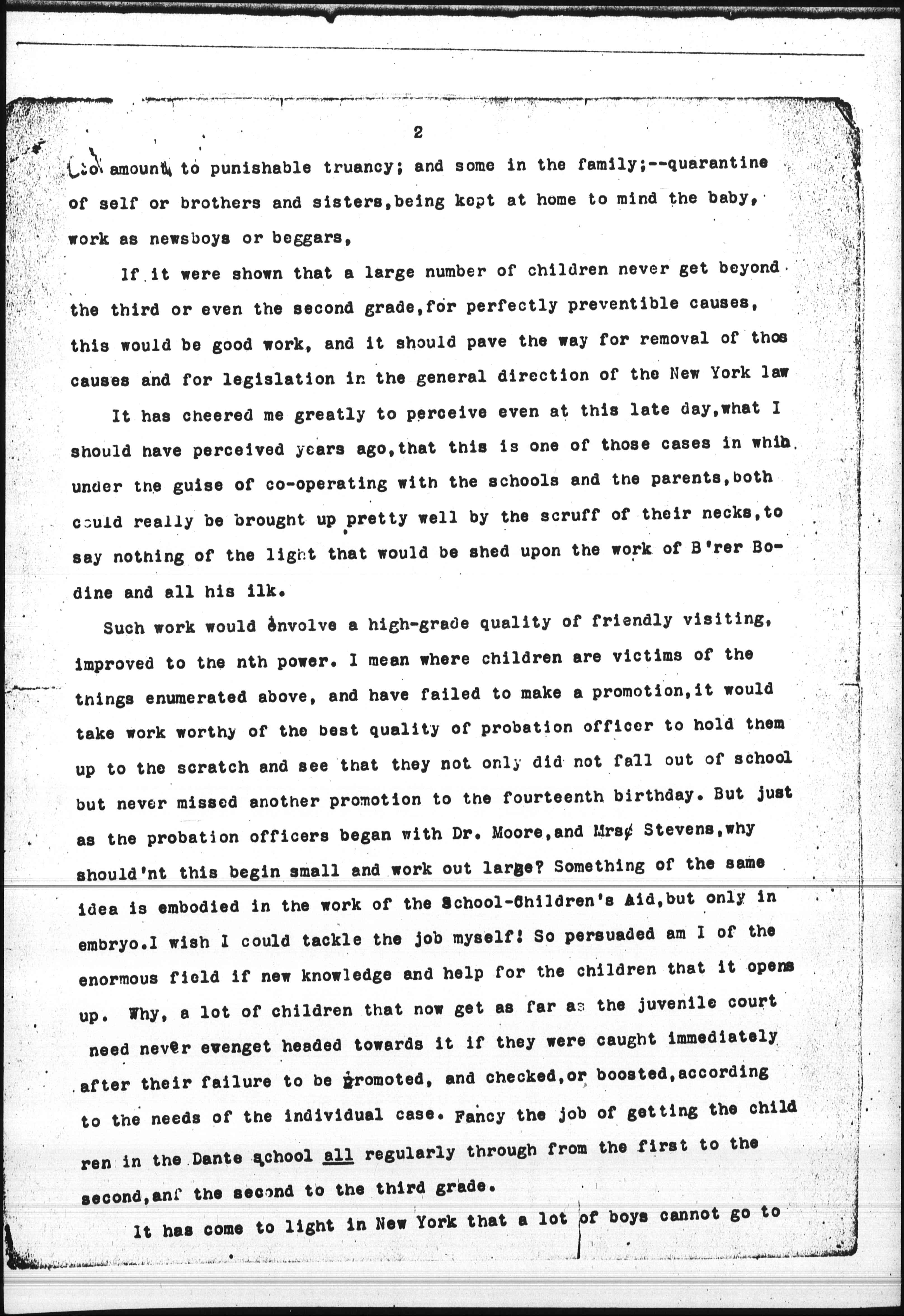 It has only recently dawned upon my dull mind that this sort of volunteer effort would afford one more reasonable reply to the ladies who ask What can we do? and then do not wish to give money for scholarships for children they do not know. I fancy it would transpire that some difficulties are inherent in the school itself -- half-time sessions overcrowded classes, incompetent teachers; some in the child itself,- poor eyes, ears, adenoids, insufficient food, inappropriate clothing, cigarette-smoking, idling in the street part of the time but not enough [page 2] to amount to punishable truancy; and some in the family; -- quarantine of self or brothers and sisters, being kept at home to mind the baby, work as newsboys or beggars.