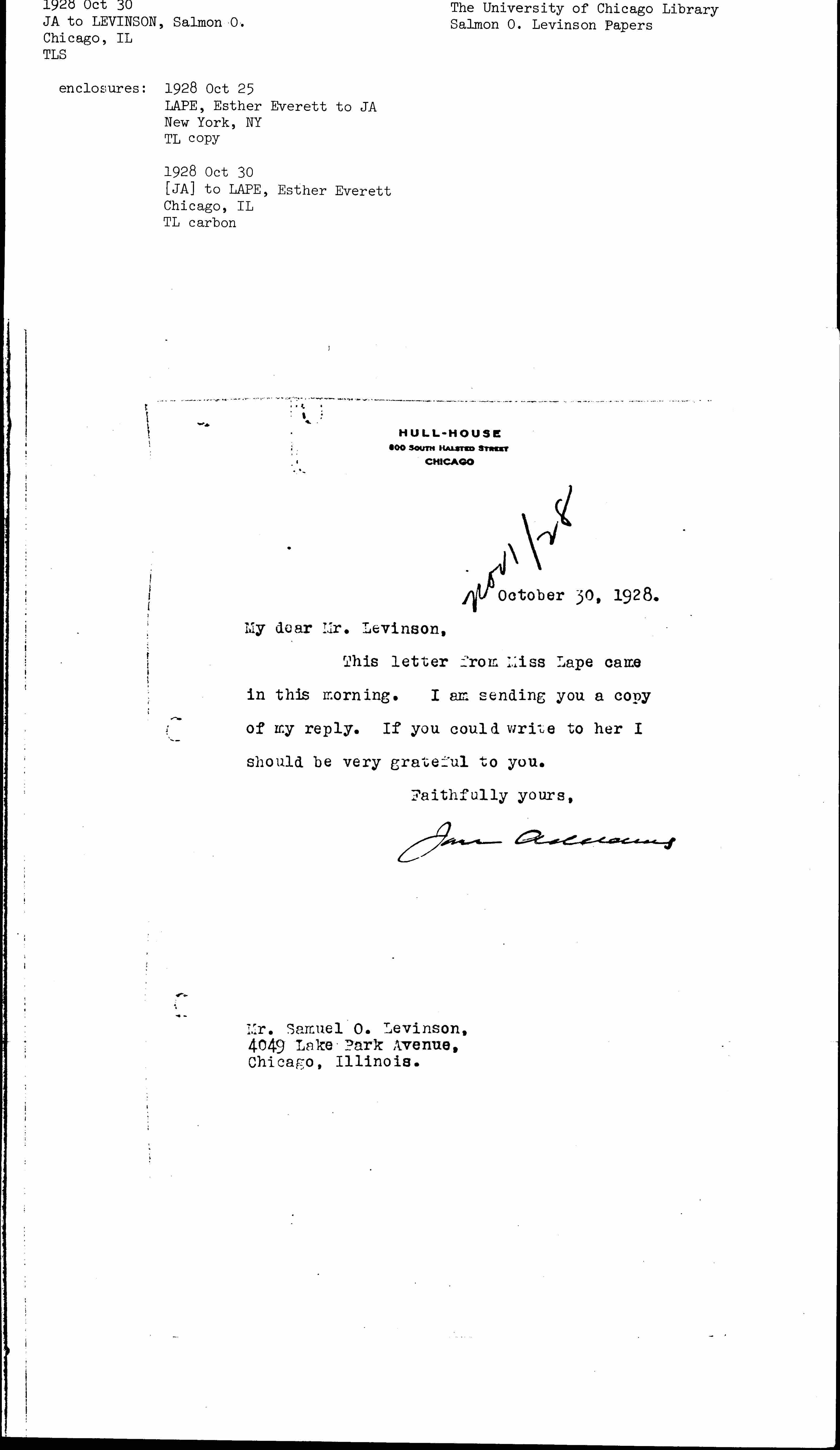 Jane Addams to Esther Everett Lape, October 30, 1928