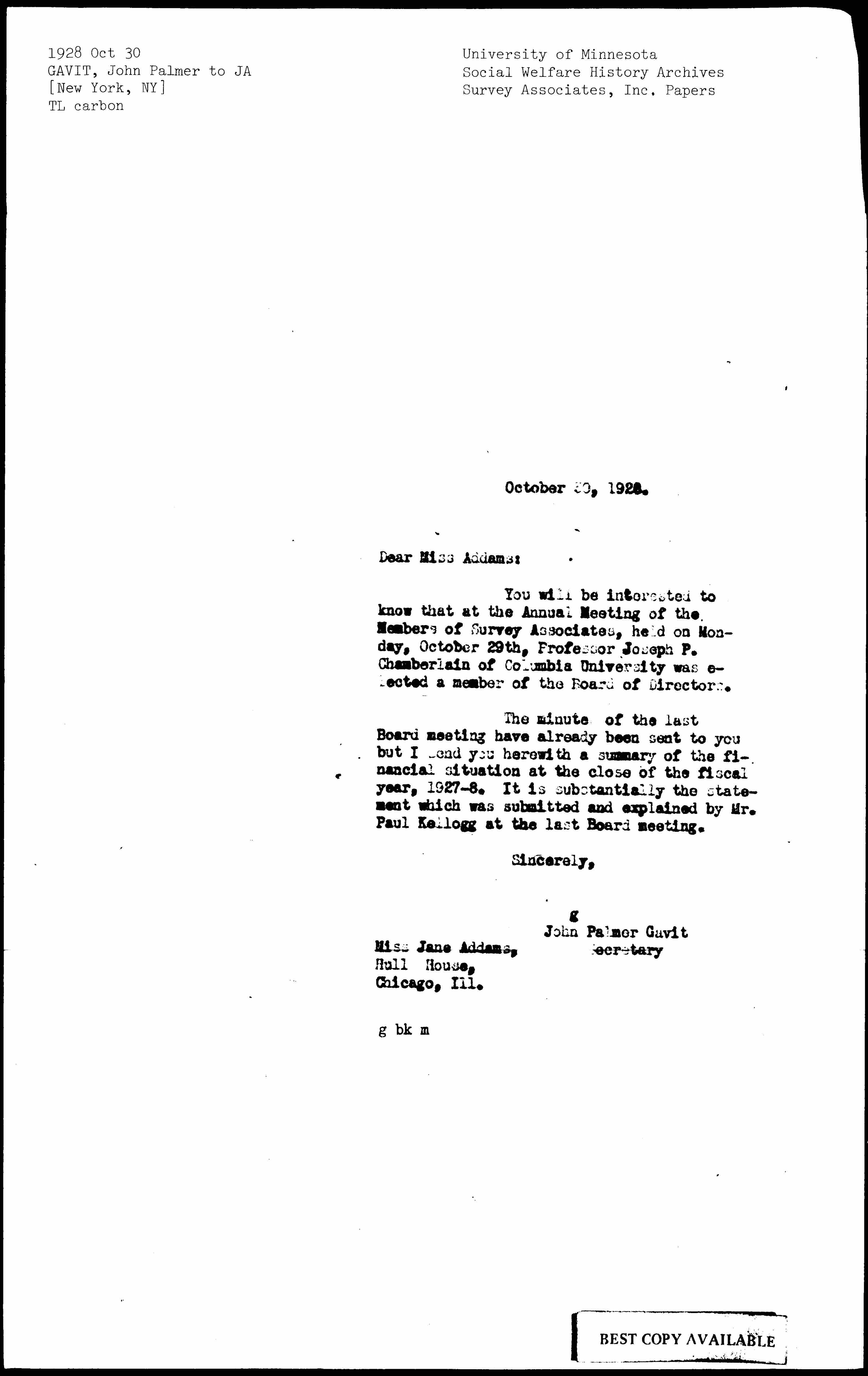 John Palmer Gavit to Jane Addams, October 30, 1928
