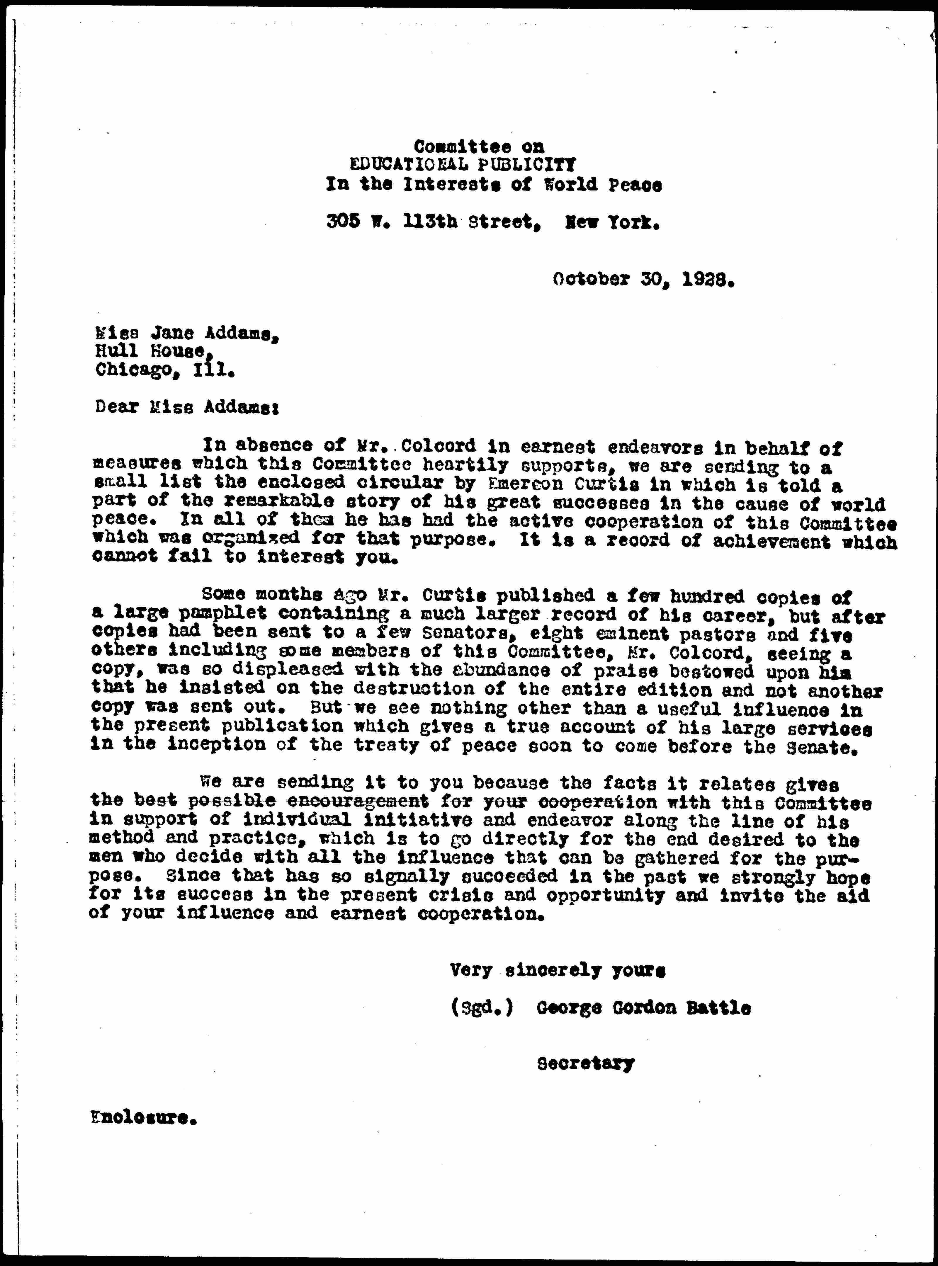 George Gordon Battle to Jane Addams, October 30, 1928