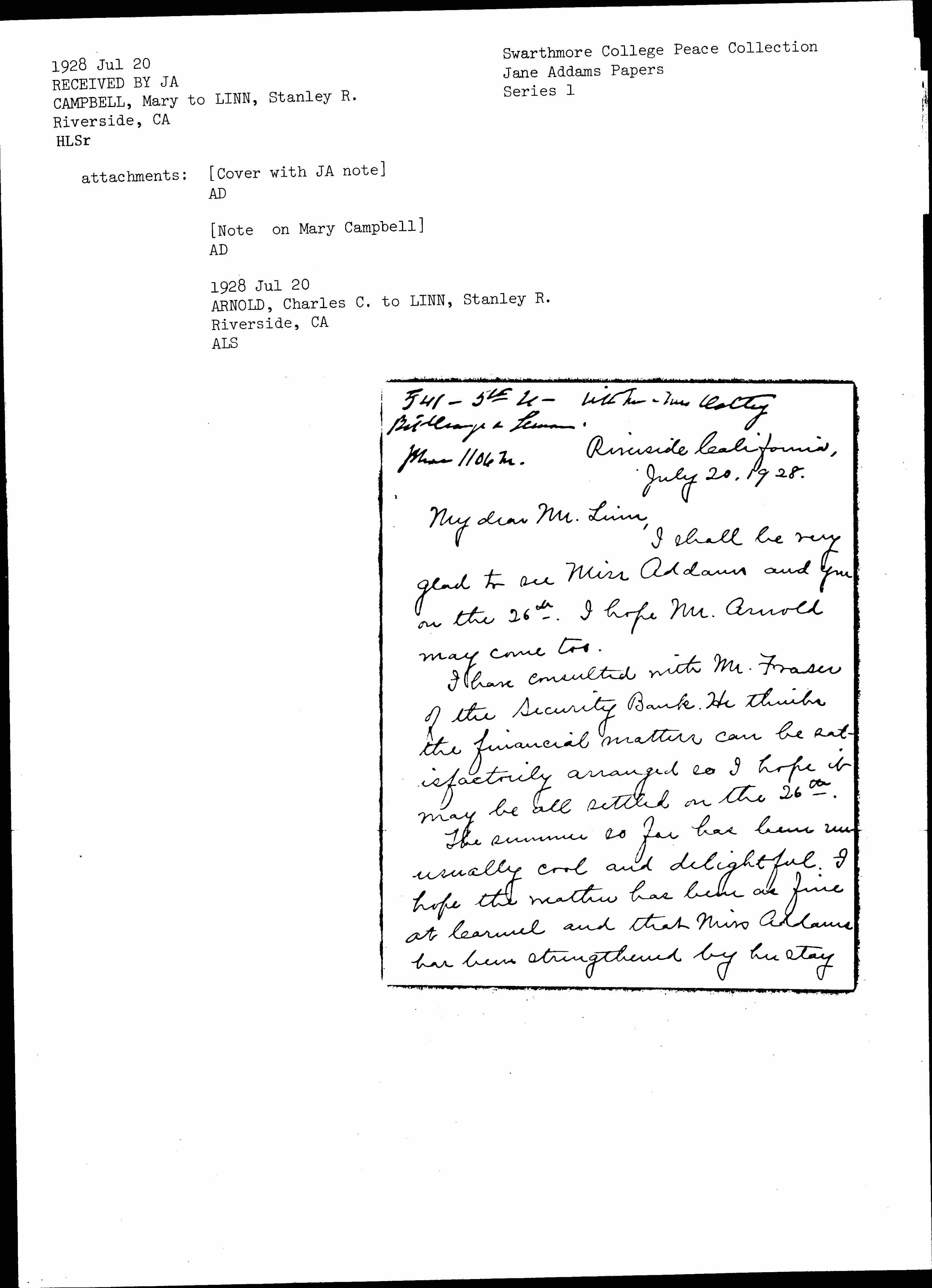 Charles Columbus Arnold to Stanley Ross Linn, July 20, 1928