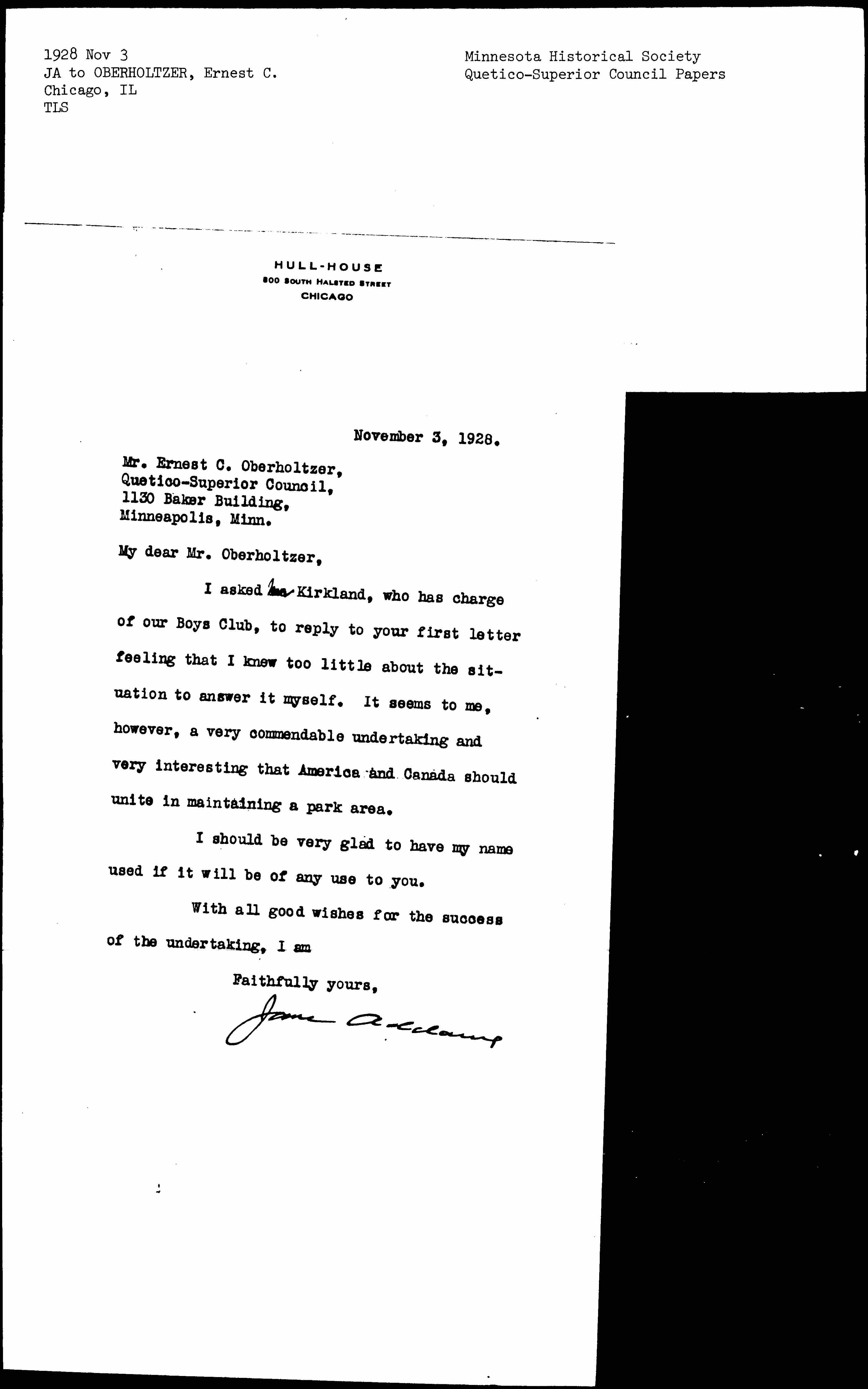 Jane Addams to Ernest Carl Oberholtzer, November 3, 1928