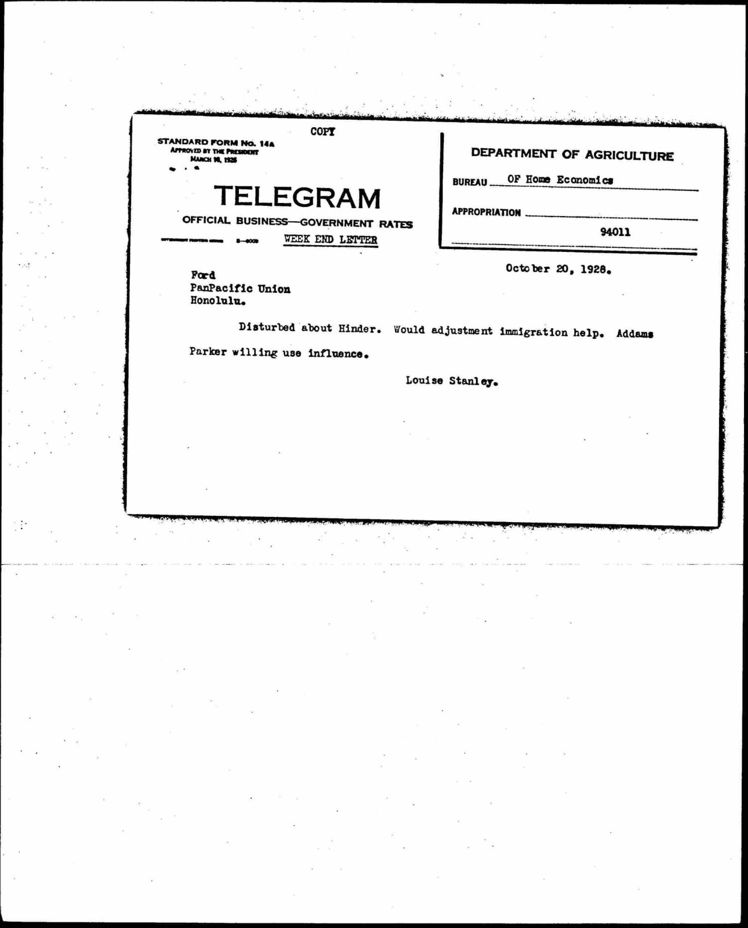 Louise Stanley to Jane Addams, October 22, 1928