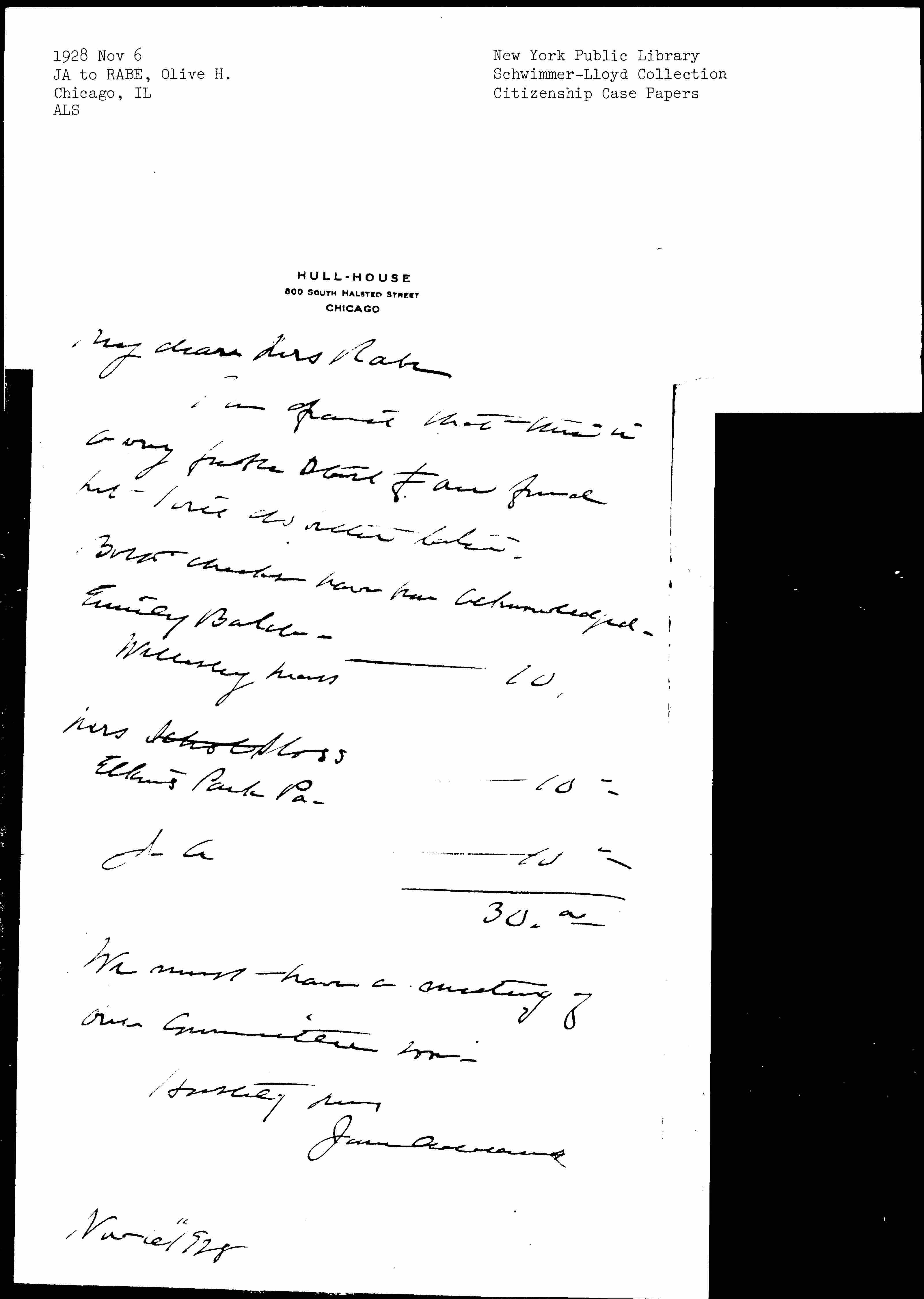 Jane Addams to Olive Hanson Rabe, November 6, 1928
