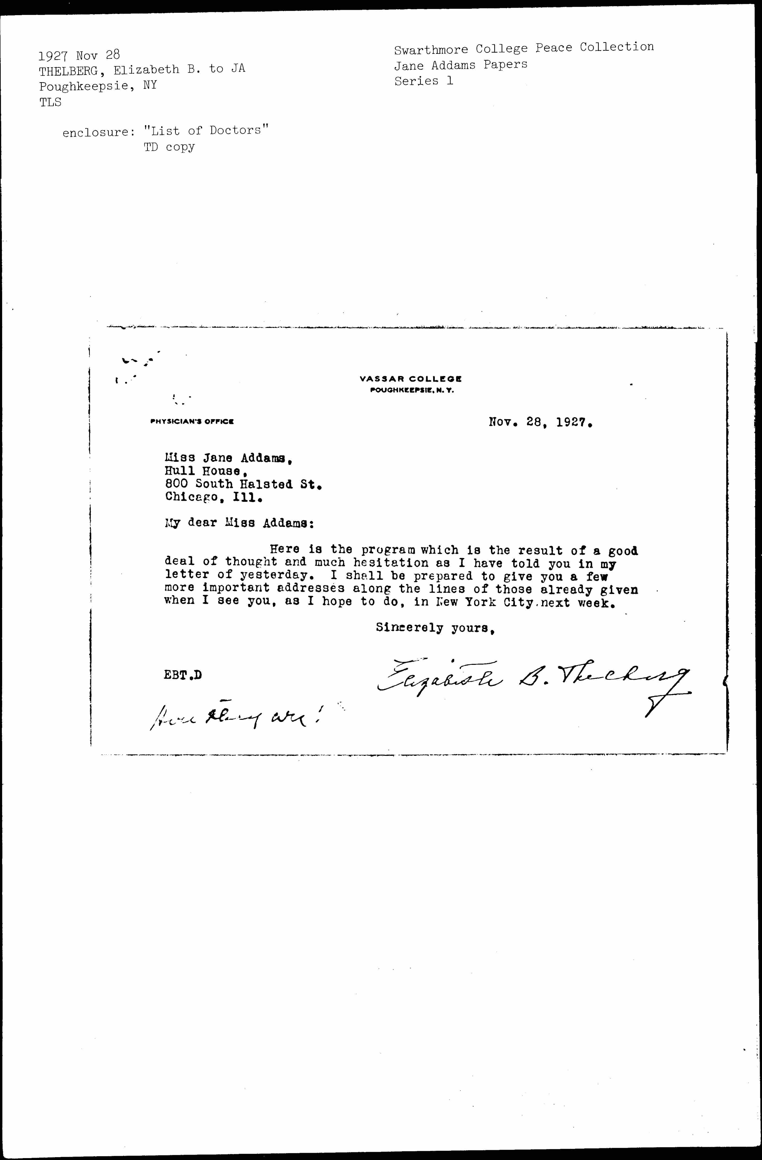 Elizabeth Burr Thelburg to Jane Addams, November 28, 1927