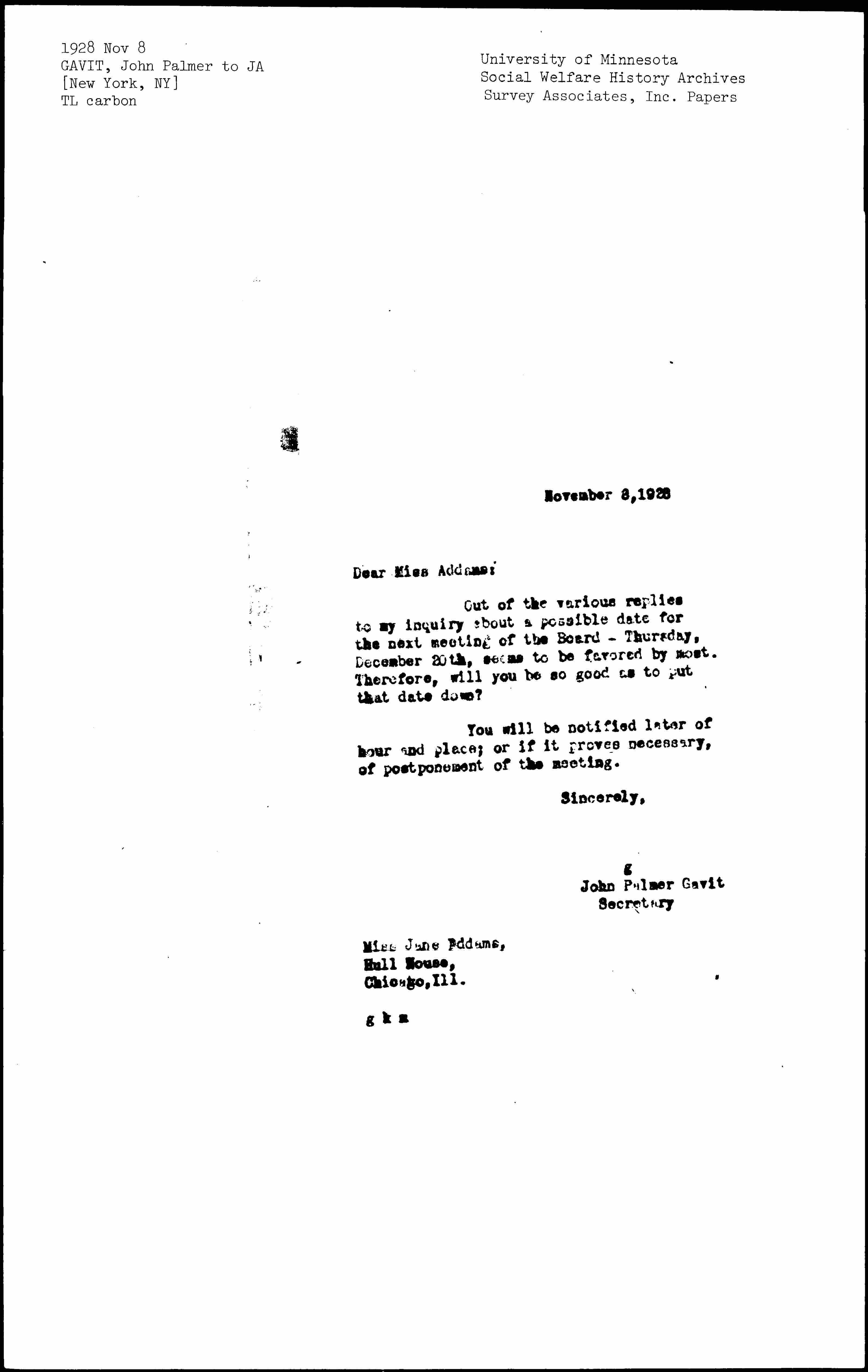 John Palmer Gavit to Jane Addams, November 8, 1928