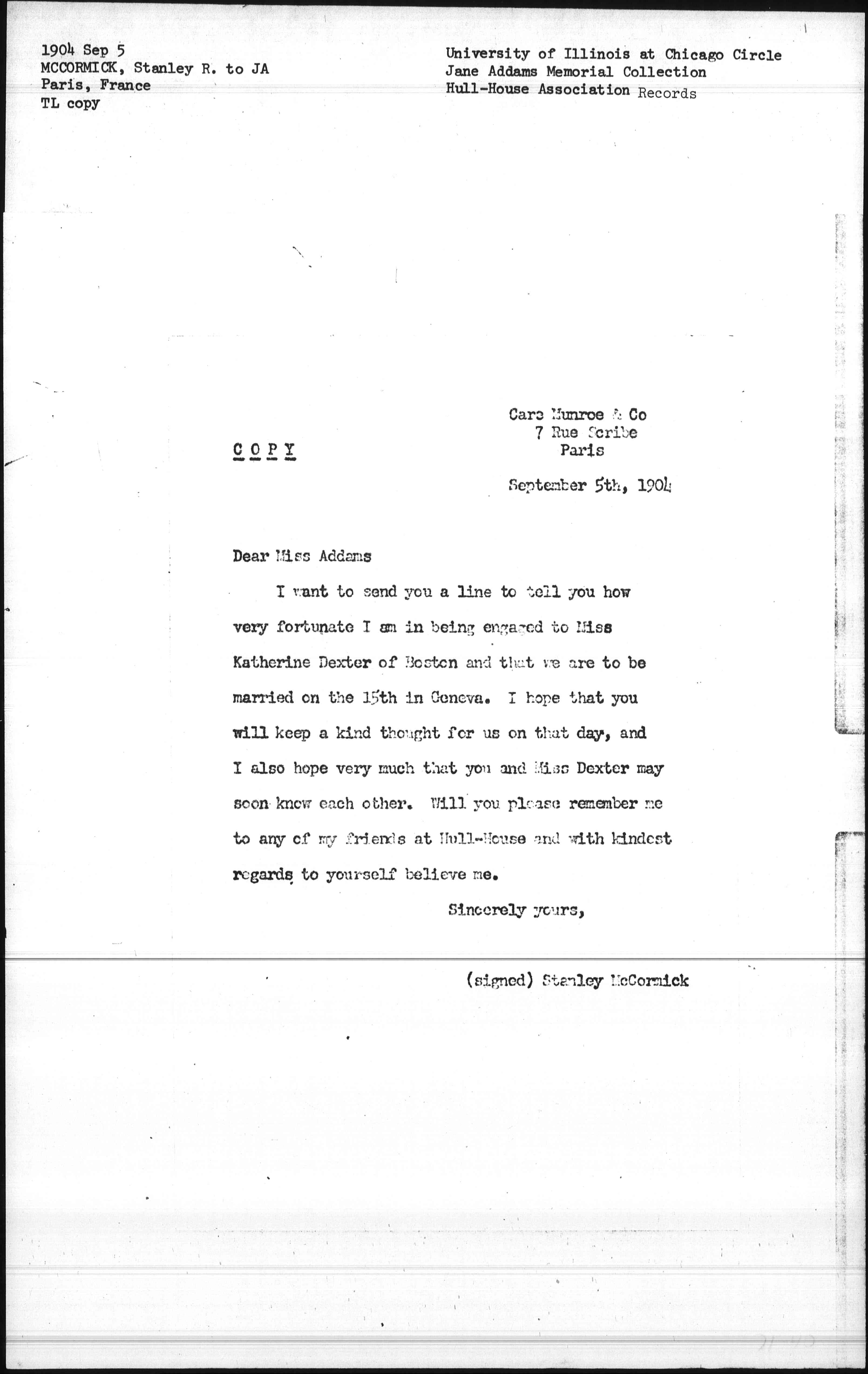 I want to send you a line to tell you how very fortunate I am in being engaged to Miss [Katharine] Dexter of Boston and that we are to be married on the 15th in Geneva. I hope that you will keep a kind thought for us on that day, and I also hope very much that you and Miss Dexter may soon know each other. Will you please remember me to any of my friends at Hull-House and with kindest regards to yourself believe me.