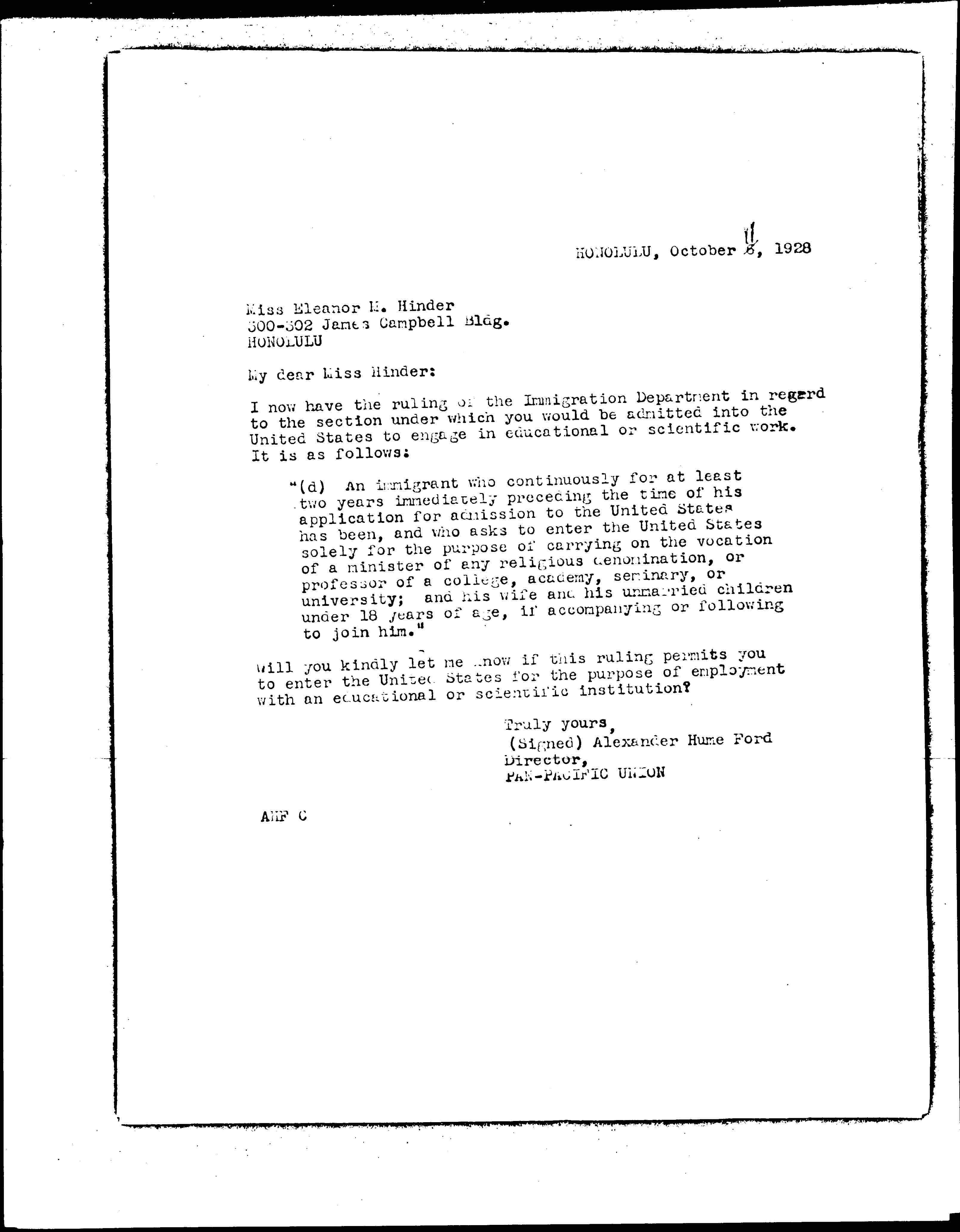 Alexander Hume Ford to Eleanor Mary Hinder, October 11, 1928