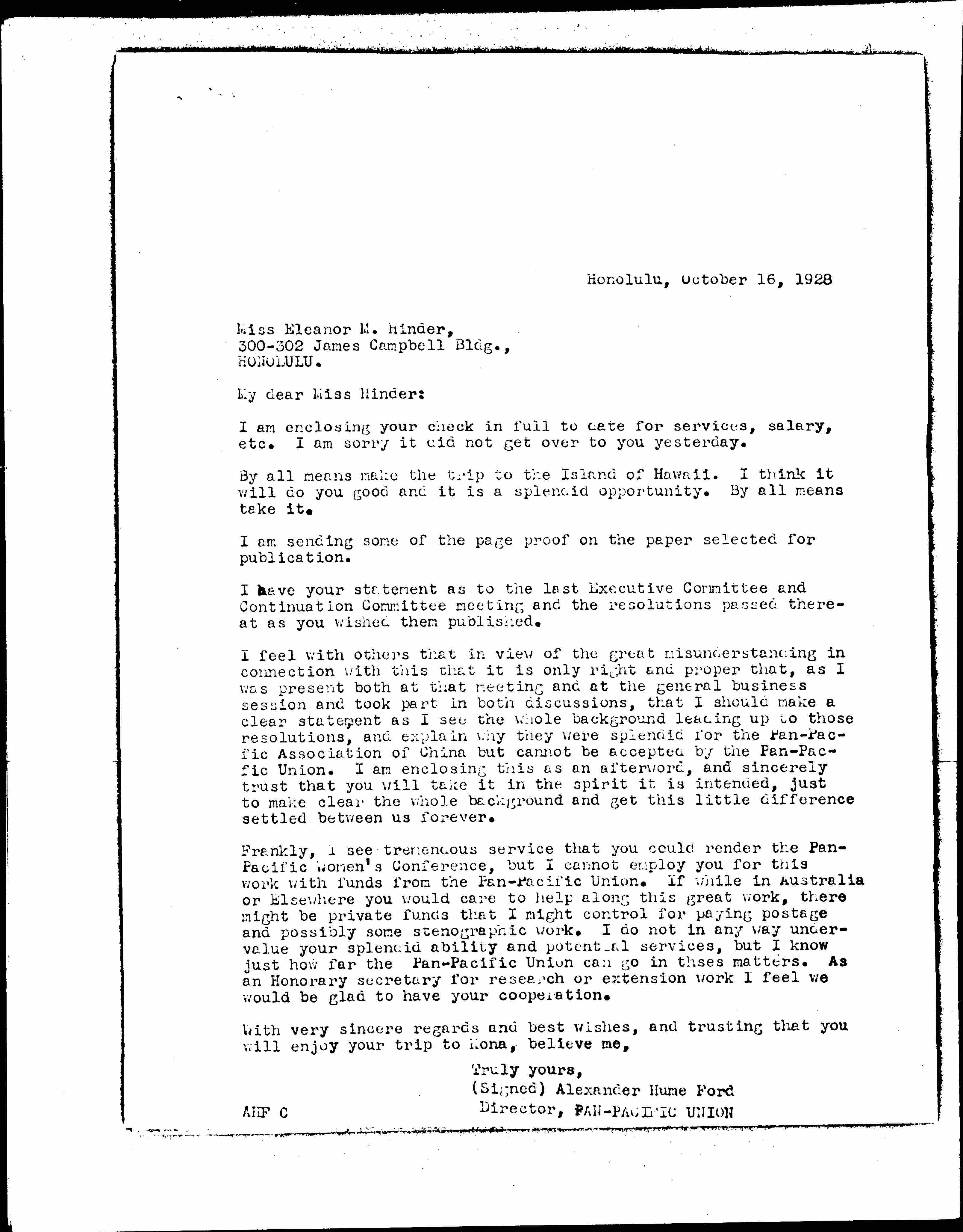 Alexander Hume Ford to Eleanor Mary Hinder, October 16, 1928