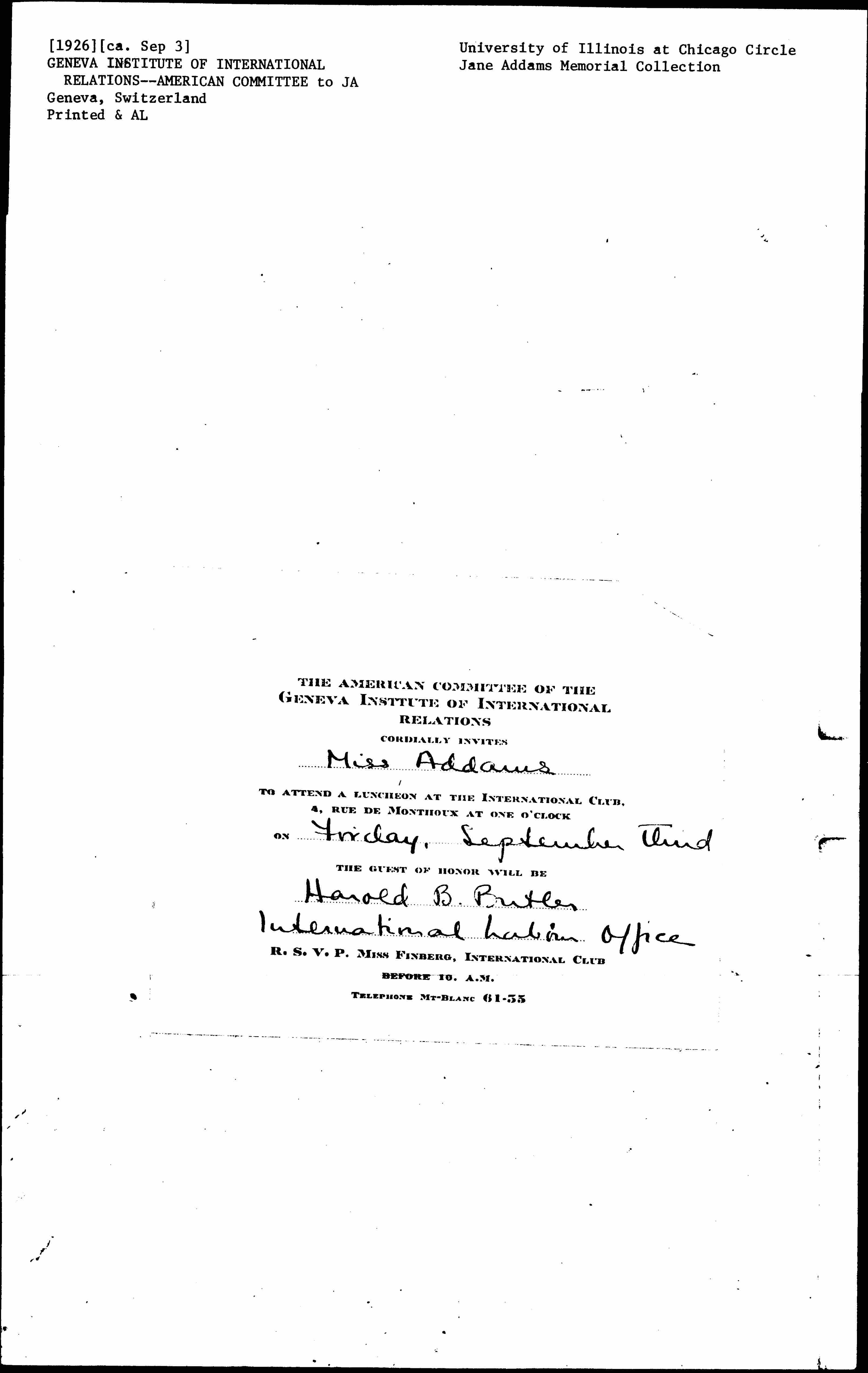 R.S.V.P. MISS FINBERG, INTERNATIONAL CLUB