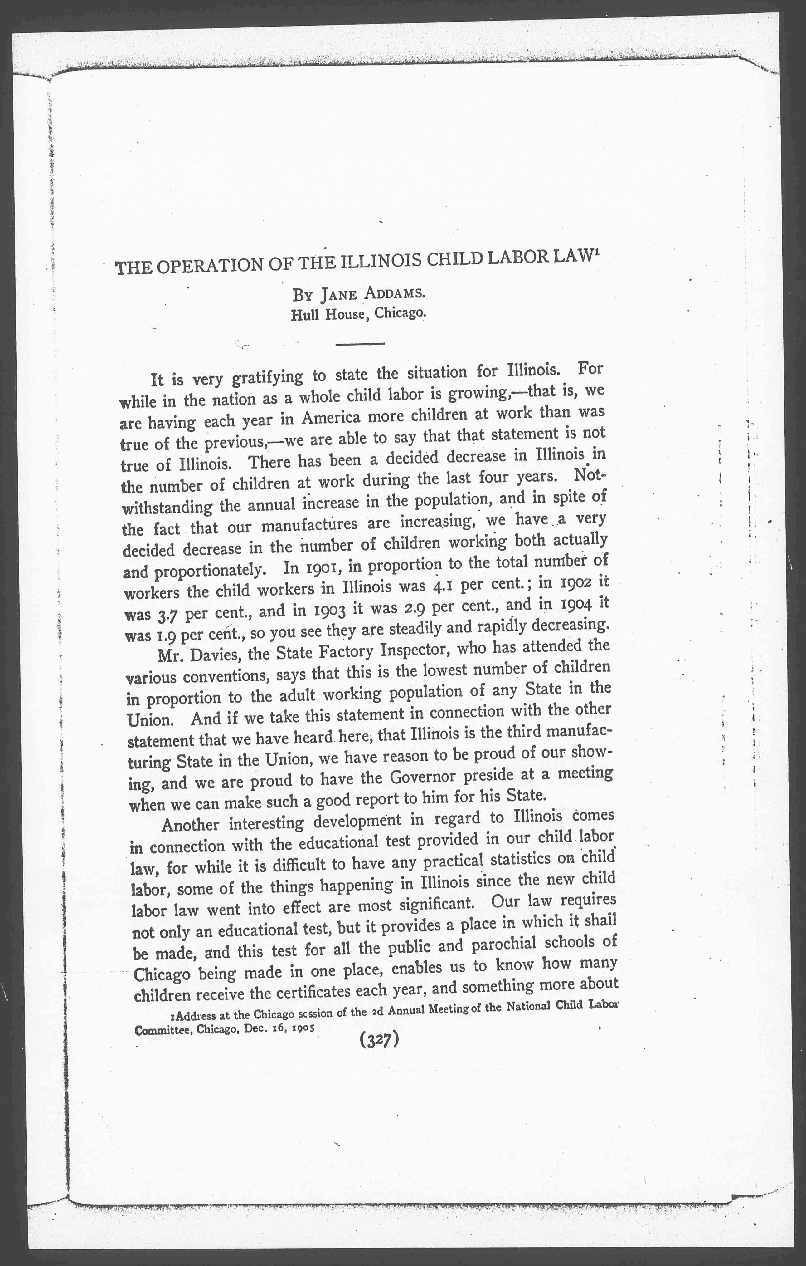 Another interesting development in regard to Illinois comes in connection with the educational test provided in our child labor law, for while it is difficult to have any practical statistics on child labor, some of the things happening in Illinois since the new child labor law went into effect are most significant. Our law requires not only an educational test, but it provides a place in which it shall be made, and this test for all the public and parochial schools of Chicago being made in one place, enables us to know how many children receive the certificates each year, and something more about [page 2] them. The total number of children who have received certificates in the last three years for the Chicago office has been 26,886. Out of that number we know they can all read and write something. I am sorry to say that they cannot all read and write English, but they can read and write some language, and the large majority of them, of course, read and write English. We have the satisfaction of knowing that of the nearly 27,000 children who have gone to work in Illinois in the past four years, they have all passed the literacy test. They have, further, all been weighed and measured, which may be an inaccurate test, but it affords, at any rate, a guaranty outside of the parents' word that they have attained an average height and age. That is something to know. For a long time did not know how many children were at work, how much they knew, nor of what size they were -- whether they were big enough for the age of fourteen years or only big enough for the age of ten.