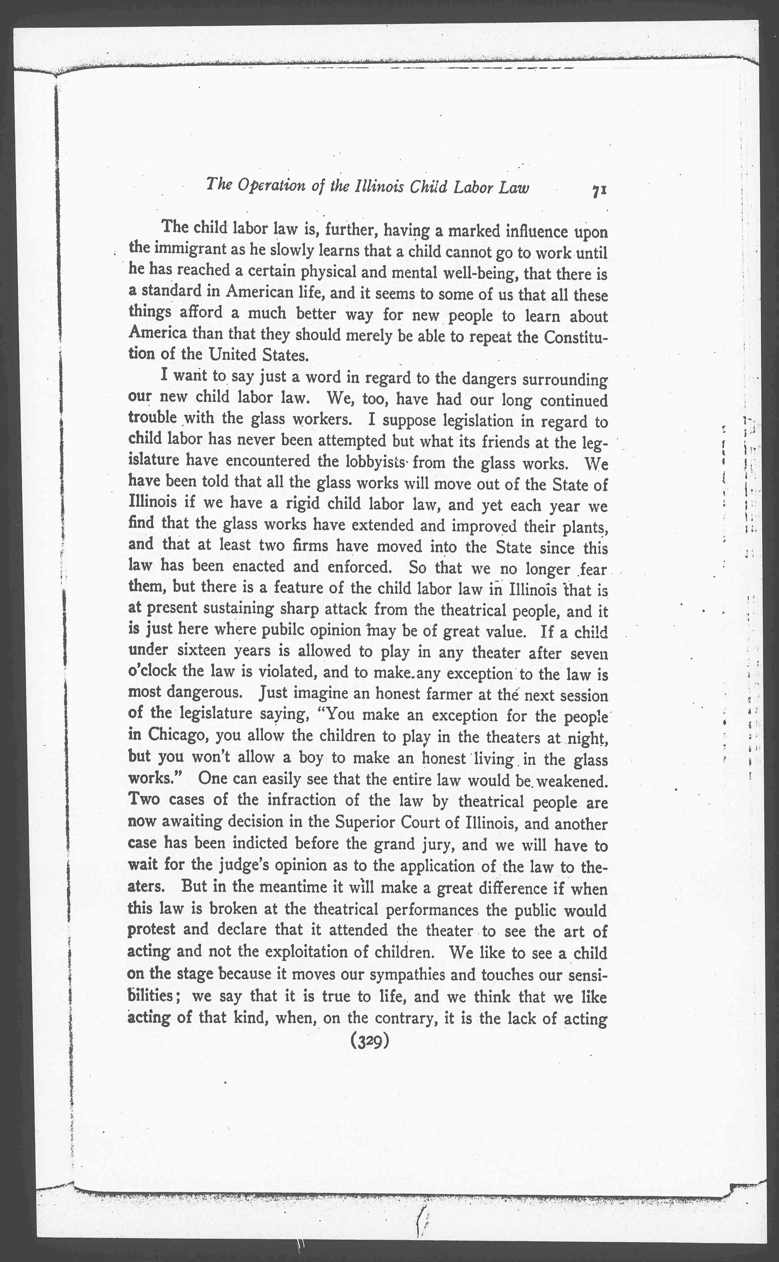 I want to say just a word in regard to the dangers surrounding our new child labor law. We, too, have had our long continued trouble with the glass workers. I suppose legislation in regard to child labor has never been attempted but what its friends at the legislature have encountered the lobbyists from the glass works. We have been told that all the glass works will move out of the State of Illinois if we have a rigid child labor law, and yet each year we find that the glass works have extended and improved their plants, and that at least two firms have moved into the State since this law has been enacted and enforced. So that we no longer fear them, but there is a feature of the child labor law in Illinois that is at present sustaining sharp attack from the theatrical people, and it is just here where public opinion may be of great value. If a child under sixteen years is allowed to play in any theater after seven o'clock the law is violated, and to make any exception to the law is most dangerous. Just imagine an honest farmer at the next session of the legislature saying, "You make an exception for the people in Chicago, you allow the children to play in the theaters at night, but you won't allow a boy to make an honest living in the glass works." One can easily see that the entire law would be weakened. Two cases of the infraction of the law by theatrical people are now awaiting decision in the Superior Court of Illinois, and another case has been indicted before the grand jury, and we will have to wait for the judge's opinion as to the application of the law to theaters. But in the meantime it will make a great difference if when this law is broken at the theatrical performances the public would protest and declare that it attended the theater to see the art of acting and not the exploitation of children. We like to see a child on the stage because it moves our sympathies and touches out sensibilities; we say that it is true to life, and we think that we like acting of that kind, when, on the contrary, it is the lack of acting [page 4] which we like, the touch of reality which the child brings to the stage. But it is hardly legitimate to keep children on the stage so that they may appeal to out sensibilities any more than it would be fair to keep the same little children begging on the street because in that way they arouse adult generosity, or as the old-fashioned circus-goer liked to see the lady put her head into the lion's mouth and gasped, waiting for something dreadful to happen. But if we really believe that acting is an art requiring preparation and a careful training, if we respect the stage sufficiently to demand artistic ability and not mere emotionalism, then we will refuse to have our sensibilities appealed to by little children on the stage. And here we see the need for national legislation in regard to children. Eighty-five per cent. of the children on the stage -- the theatrical people say ninety-two per cent. of the children on the stage -- in America are supplied in New York. The New York Law permits these children to go on the stage after they have been examined by a certain children's society there. This is in accordance with the New York law, but when they reach Chicago we have to deal with them according to the Illinois law. I wish very much that we all may try to arouse some sentiment against this exploitation of children on the stage. Here is where the consumer is touched very directly. When we buy a glass bottle which we think may have been made by a child we are not quite certain about it, and it is at best remote. But going to a theater and looking at a little child and encouraging that sort of thing because it arouses a sickly sort of sentiment, is certainly to induce the managers to continue it. It would be very easy to say to the managers of the theater, "We came here to see the legitimate drama." Mr. Daly and other clever managers insist that there is no play requiring children which cannot be better done by grown people taking the children's parts. One cannot imagine Henry Irving putting children upon the stage; it would have hurt his artistic ideas of what a play ought to be. Let us see if we cannot put aside this emotionalism and stand by the child labor law from the side of art as well as of humanity. It is easy to discuss the wrongs in the South and to agitate for laws affecting manufacturers, but here in Chicago where in relation to the theaters the law touches us directly we are in sympathy with the law, and here is an opportunity to aid in its enforcement, and I hope that we will all endeavor to do our share.