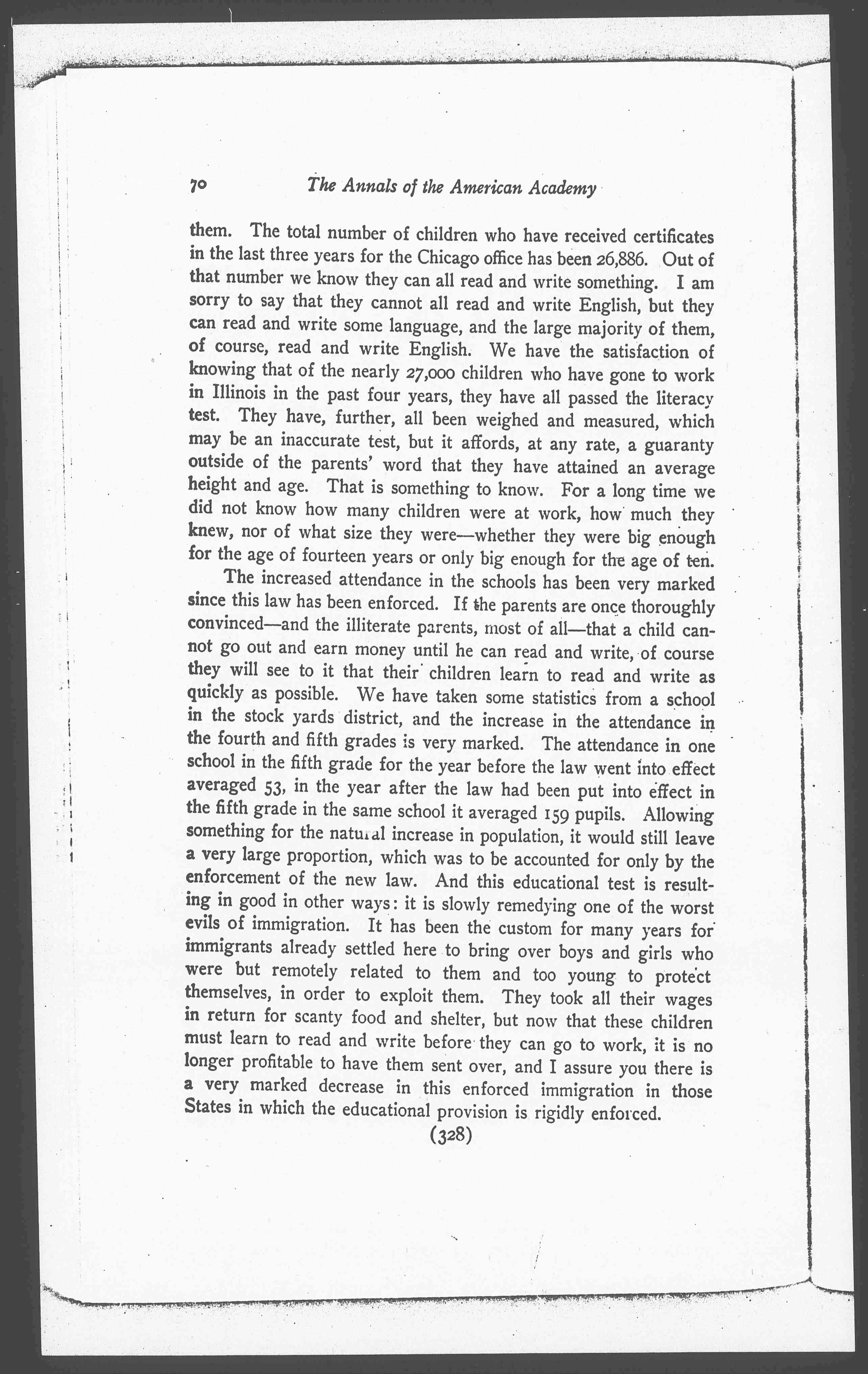 The increased attendance in the schools has been very marked since this law has been enforced. If the parents are once thoroughly convince -- and the illiterate parents, most of all -- that a child cannot go out and earn money until he can read and write, or course they will see to it that their children learn to read and write as quickly as possible. We have taken some statistics from a school in the stock yards district, and the increase in the attendance in the fourth and fifth grades is very marked. The attendance in one school in the fifth grade for the before the law went into effect averaged 53, in the year after the law had been put into effect in the fifth grade the same school it averaged 159 pupils. Allowing something for the natural increase in population it would still leave a very large proportion, which was to be accounted for only by the enforcement of the new law. And this educational test is resulting in good in other ways: it is slowly remedying one of the worst evils of immigration. It has been the custom for many years for immigrants already settled here to bring over boys and girls who were but remotely related to them and too young to protect themselves, in order to exploit them. They took all their wages in return for scanty food and shelter, but now that these children must learn to read and write before they can go to work, it is no longer profitable to have them sent over, and I assure you there is a very marked decrease in this enforced immigration in those States in which the educational provision is rigidly enforced. [page 3]