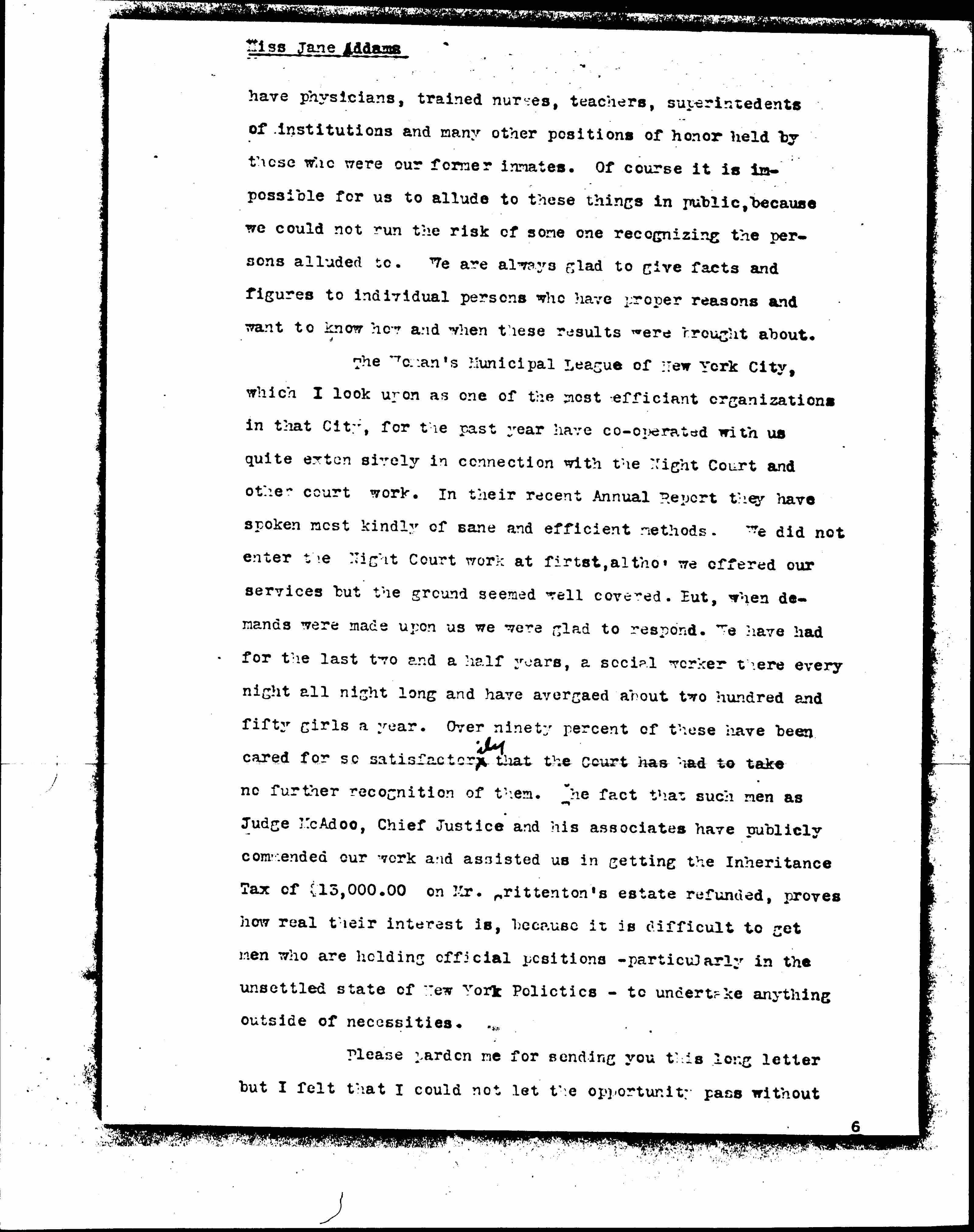 The Woman's Municipal League of New York City, which I look upon as one of the most [efficient] organizations in that City, for the past year have cooperated with us quite extensively in connection with the Night Court and other court work. In their recent Annual Report they have spoken most kindly of sane and efficient methods. We did not enter the Night Court work at first, [although] we offered our services but the ground seemed well covered. But, when demands were made upon us we were glad to respond. We have had for the last two and a half years, a social worker there every night all night long and have averaged about two hundred and fifty girls a year. Over ninety percent of these have been cared for so satisfactorily that the Court has had to take no further recognition of them. The fact that such men as Judge McAdoo, Chief Justice and his associates have publicly commended our work and assisted us in getting the Inheritance Tax of $13,000.00 on Mr. Crittenton's estate refunded, proves how real their interest is, because it is difficult to get men who are holding official positions – particularly in the unsettled state of New York Politics – to undertake anything outside of necessities.
