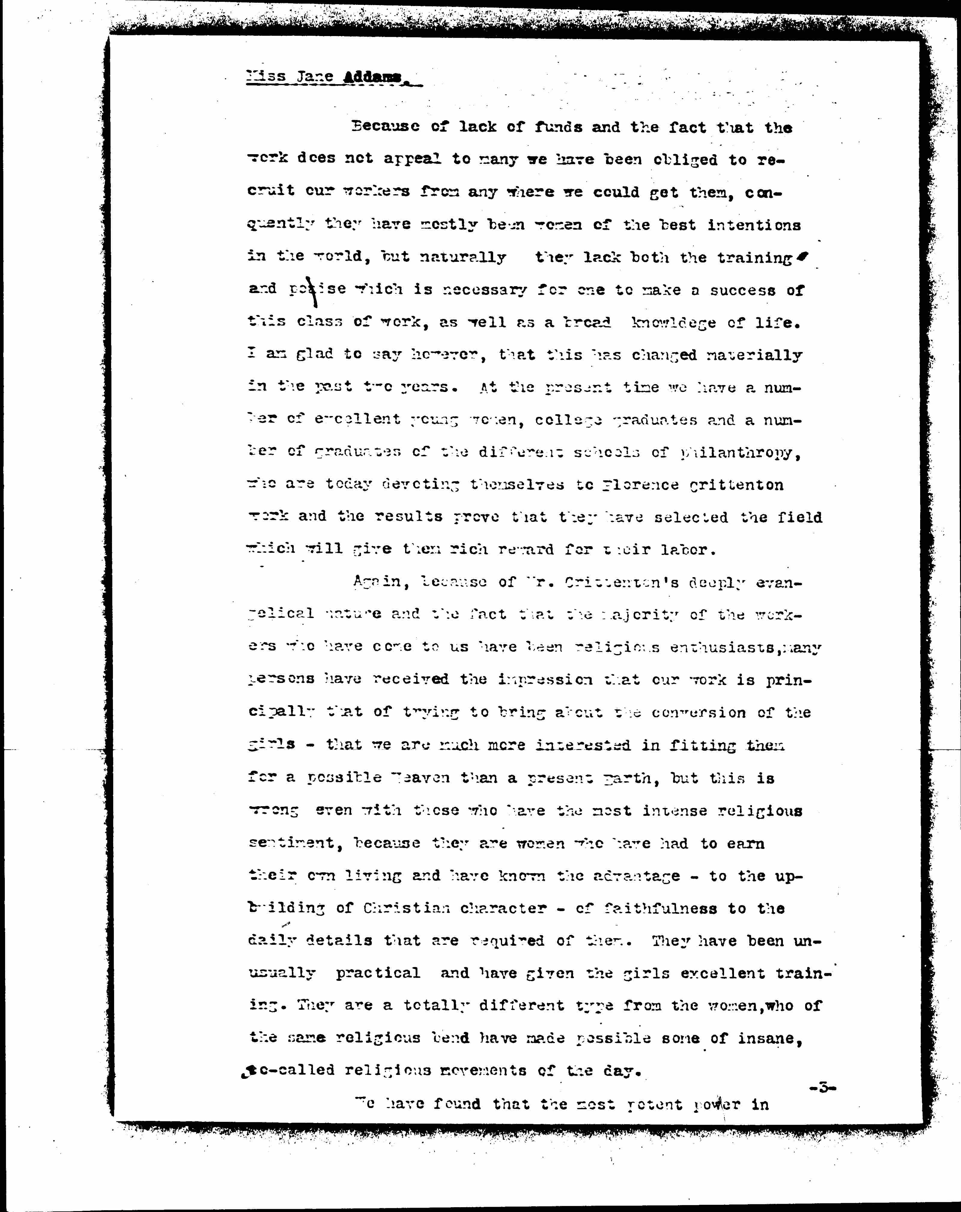 I feel that nothing is more needed at the present time than to make known the various remedial agencies which are at work in behalf of these girls and the results which they have accomplished. In recalling these naturally my heart turns to the Chain of Florence Crittenton Homes as a valuable part of the machinery for this work of reclamation. It has always pained me that the general public has so largely misunderstood the spirit which has always animated the National Florence Crittenton Mission. I cannot blame them however for this because so many of our homes and work in them, themselves have not a clear idea of the opportunities for which they responsible. [page 3]