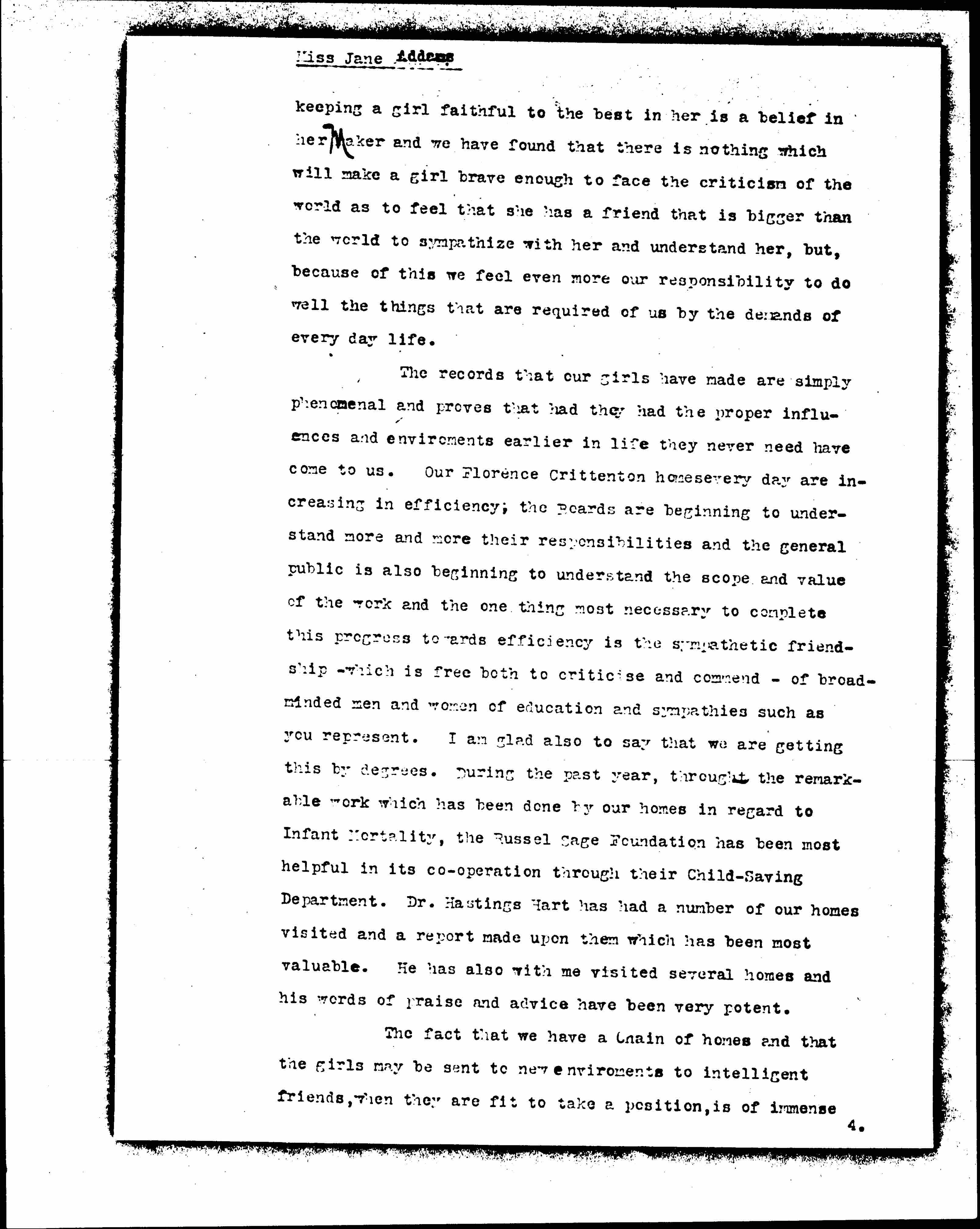 The records that our girls have made are simply phenomenal and proves that had the proper influences and environments earlier in life they never need have come to us. Our Florence Crittenton homes every day are increasing in efficiency; the Bcards are beginning to understand more and more their responsibilities and the general public is also beginning to understanding the scope and value of the work and the one thing most necessary to complete this progress towards efficiency is the sympathetic friendship –- which is free both to [criticize] and commend –- of broad minded men and women of education and sympathies such as you represent. I am glad also to say that we are getting this be degrees. During the past year, through the remarkable work which has been done by our homes in regard to Infant Morality, the Russel Sage Foundation has been helpful in its [cooperation] through their Child-Saving Department. Dr. Hastings Hart has had a number of our homes visited and a report made upon them which has been most valuable. He also with me visited several homes and his words of praise and advice have been very potent.