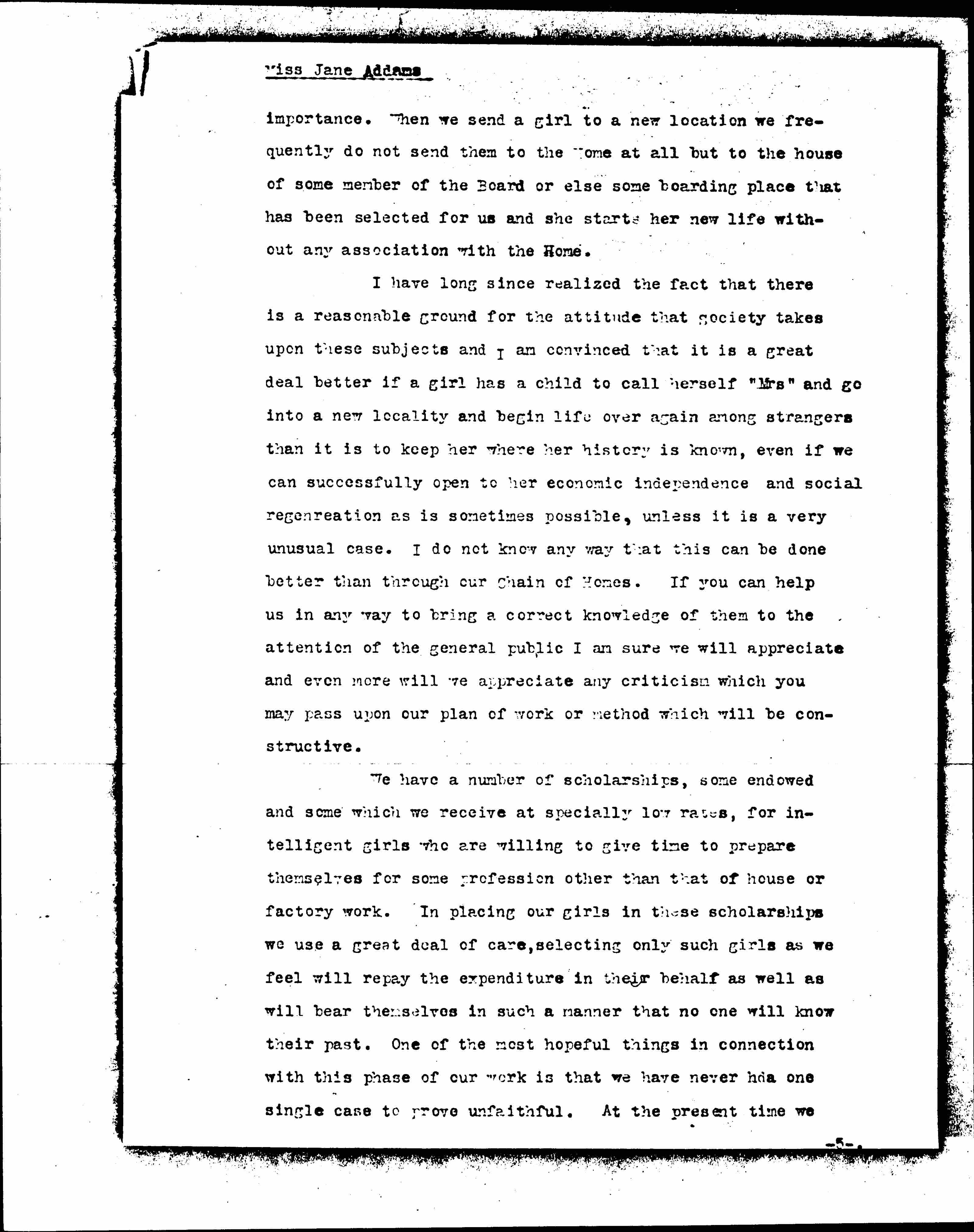 The fact that we have a Chain of homes and that the girls may be sent to new [environments] to intelligent friends, when they are fit to take a position, is of immense [page 5] importance. When we send a girl to a new location we frequently do not send them to the Home at all but to the house of some member of the Board or else some boarding place that has been selected for us and she starts her new life without any association with the Home.