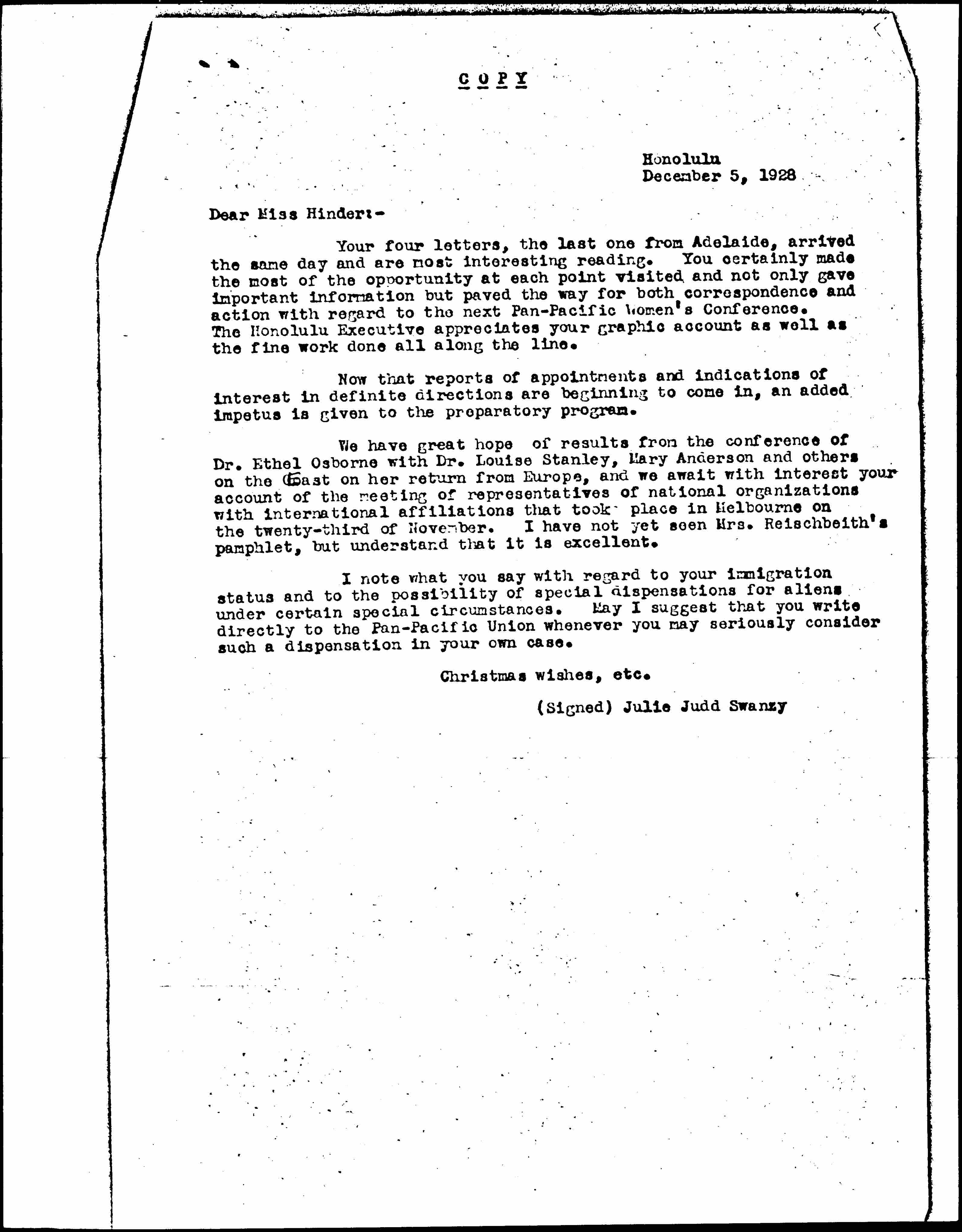 Julie Judd Swanzy to Eleanor Mary Hinder, December 5, 1928