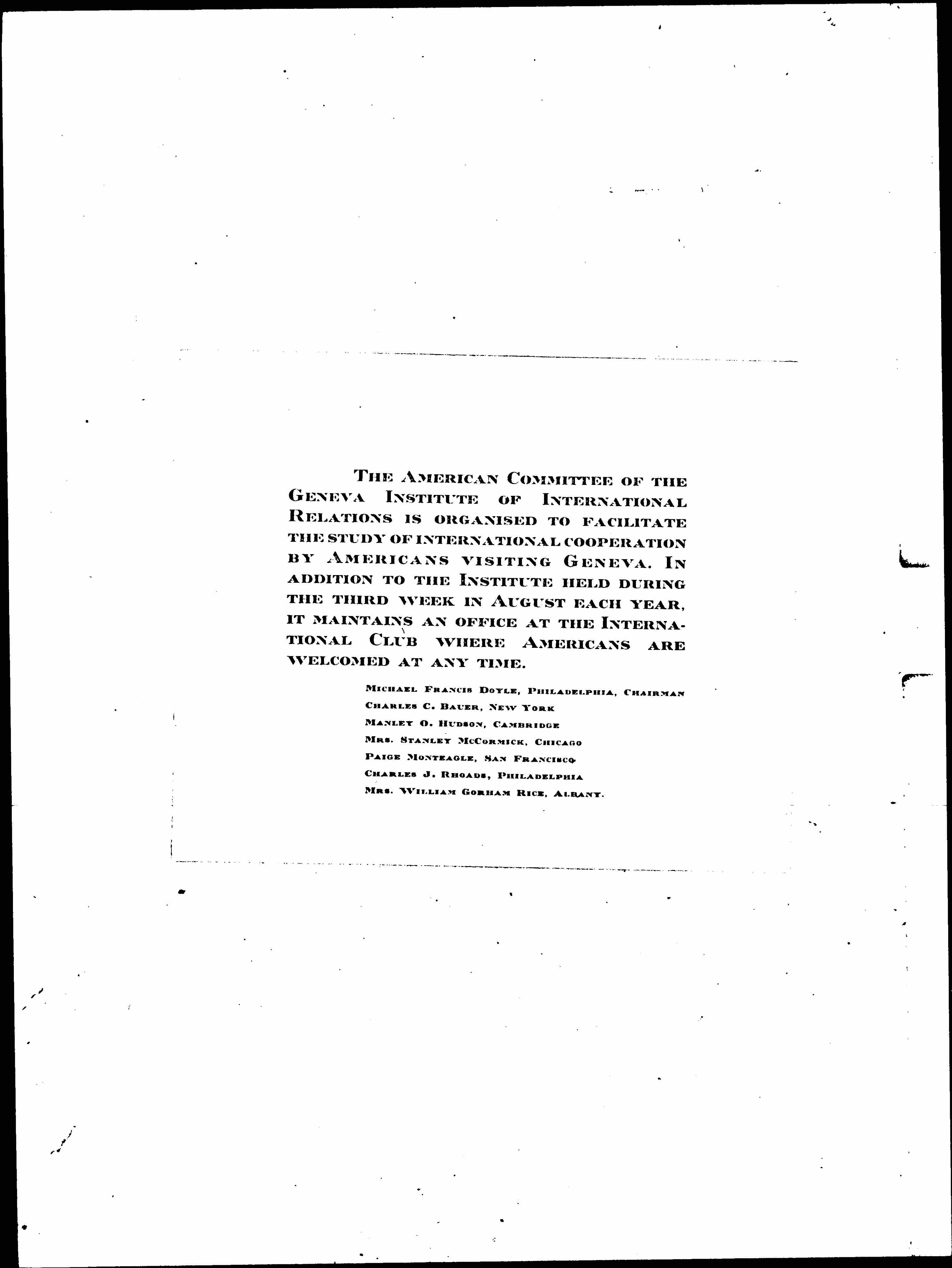 THE AMERICAN COMMITTEE OF THE GENEVA INSTITUTE OF INTERNATIONAL RELATIONS IS [ORGANIZED] TO FACILITATE THE STUDY OF INTERNATIONAL COOPERATION BY AMERICANS VISITING GENEVA. IN ADDITION TO THE INSTITUTE HELD DURING THE THIRD WEEK IN AUGUST EACH YEAR, IT MAINTAINS AN OFFICE AT THE INTERNATIONAL CLUB WHERE AMERICANS ARE WELCOMED AT ANY TIME.
