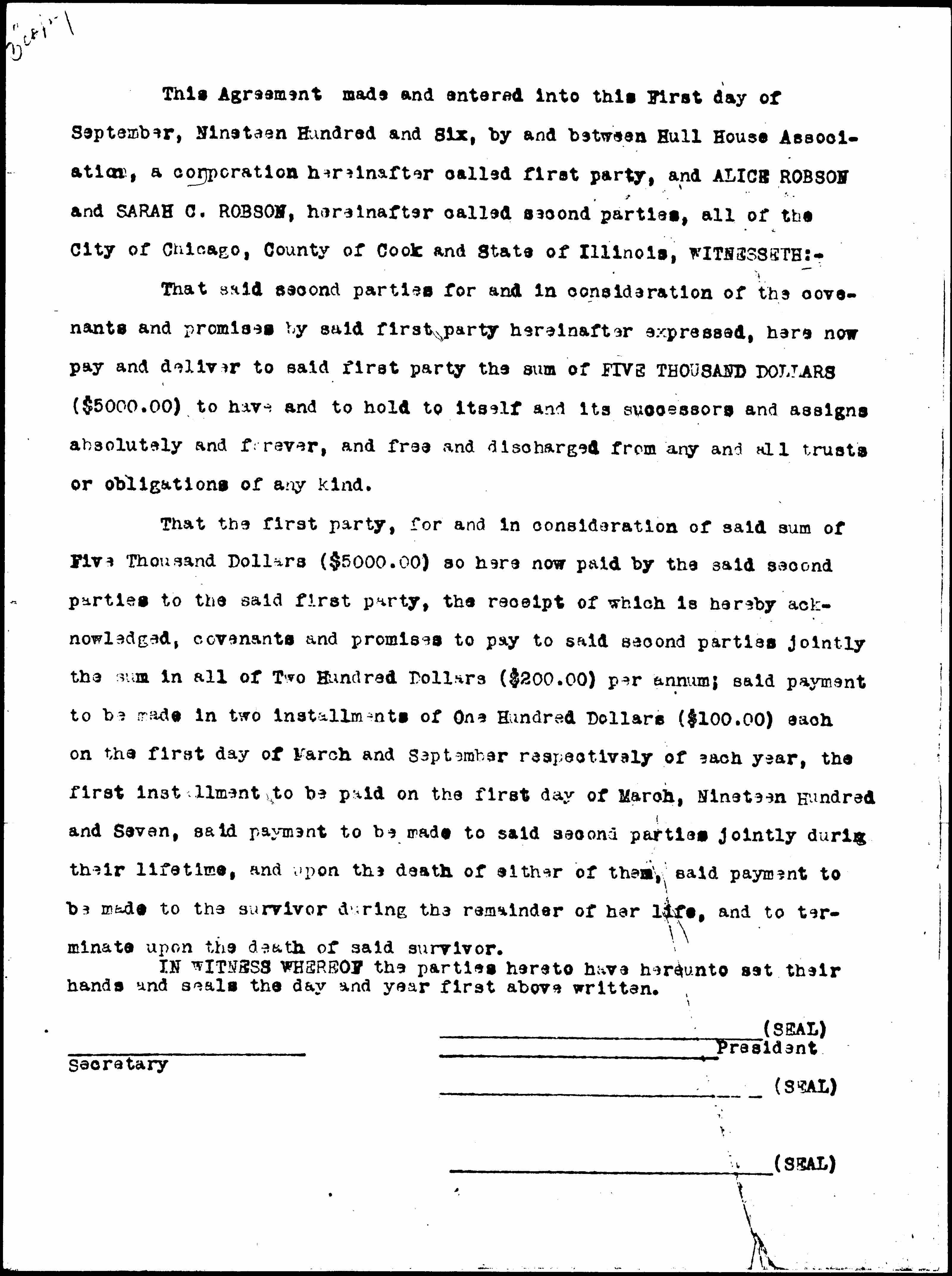 This Agreement made and entered into this First day of September, Nineteen Hundred and Six by and between Hull House Association, a corporation hereinafter called first party, and ALICE ROBSON and SARAH C. ROBSON, hereinafter called second parties, all of the City of Chicago, County of Cook and State of Illinois, WITNESSETH:--