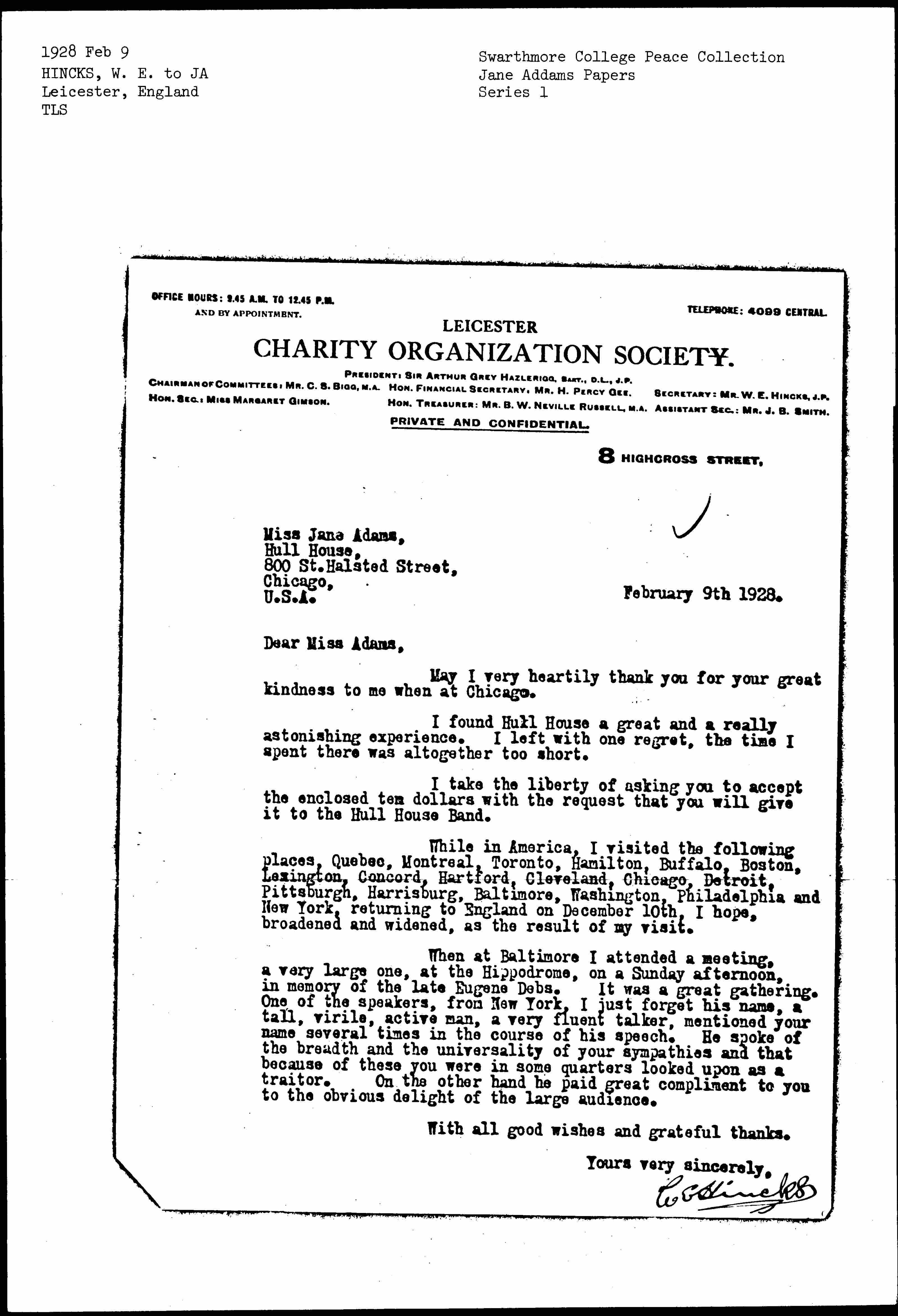 William Edwin Hincks to Jane Addams, February 9, 1928