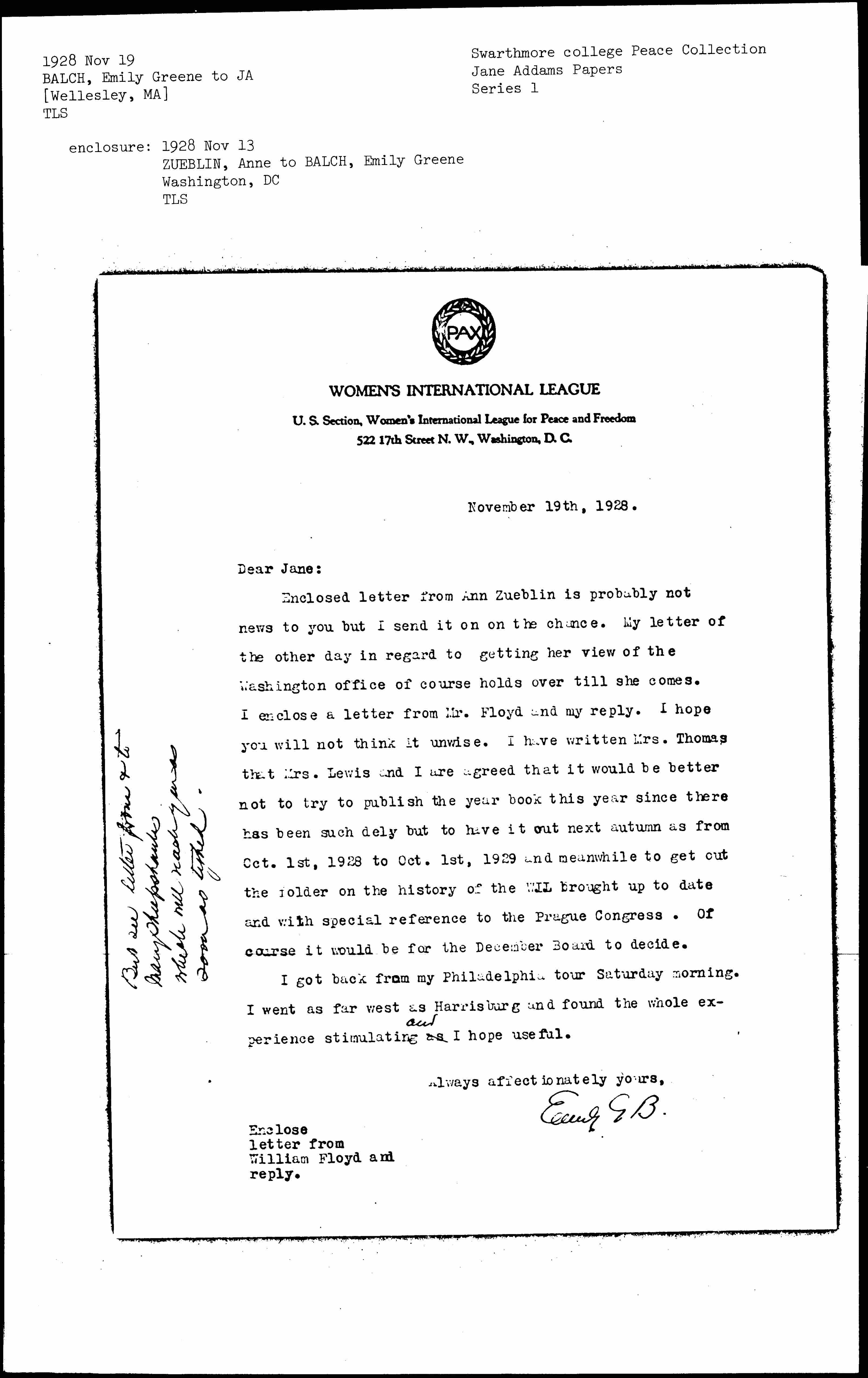 Emily Greene Balch to Jane Addams, November 19, 1928