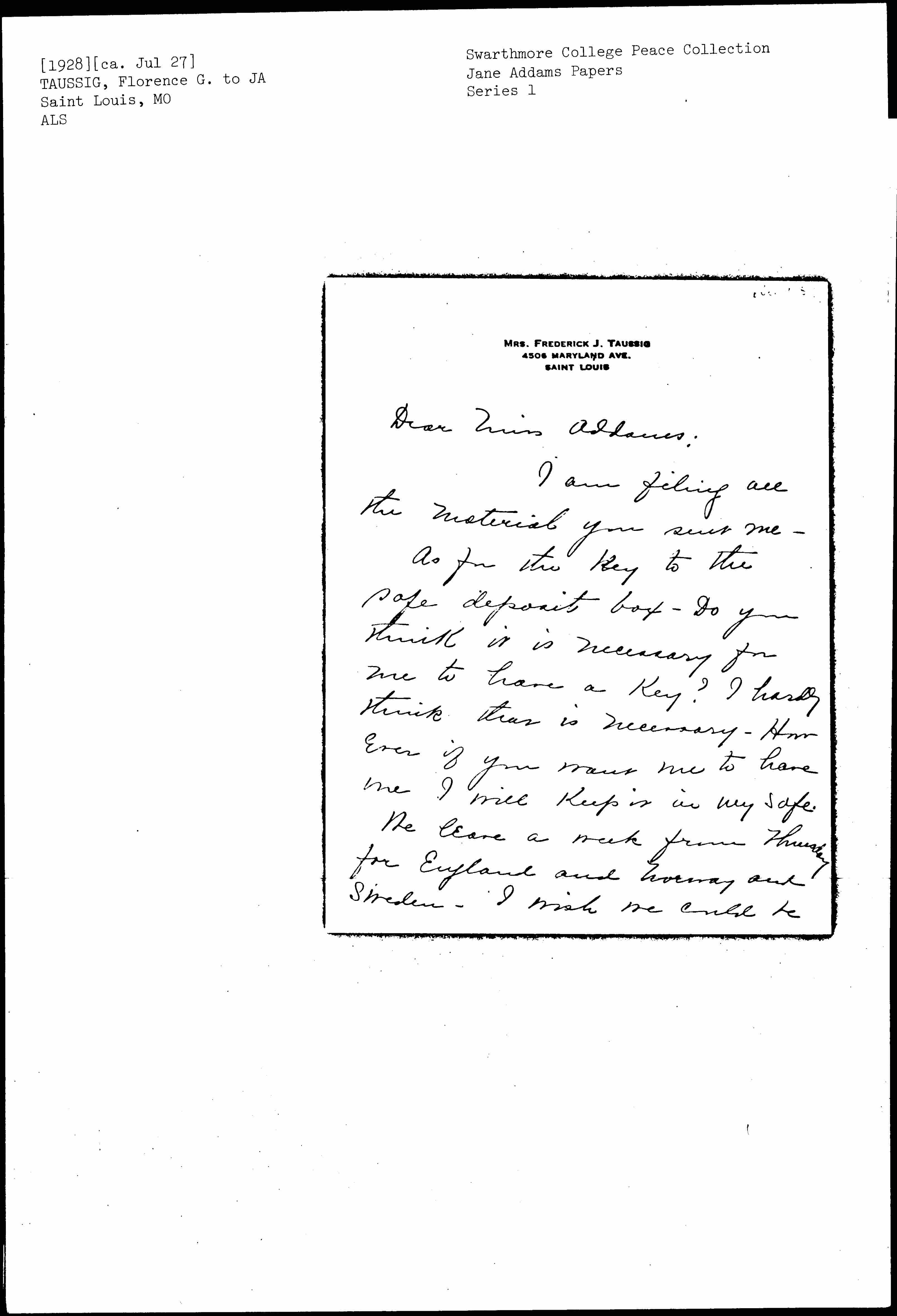 Florence Gottschalk Taussig to Jane Addams, July 27, 1928