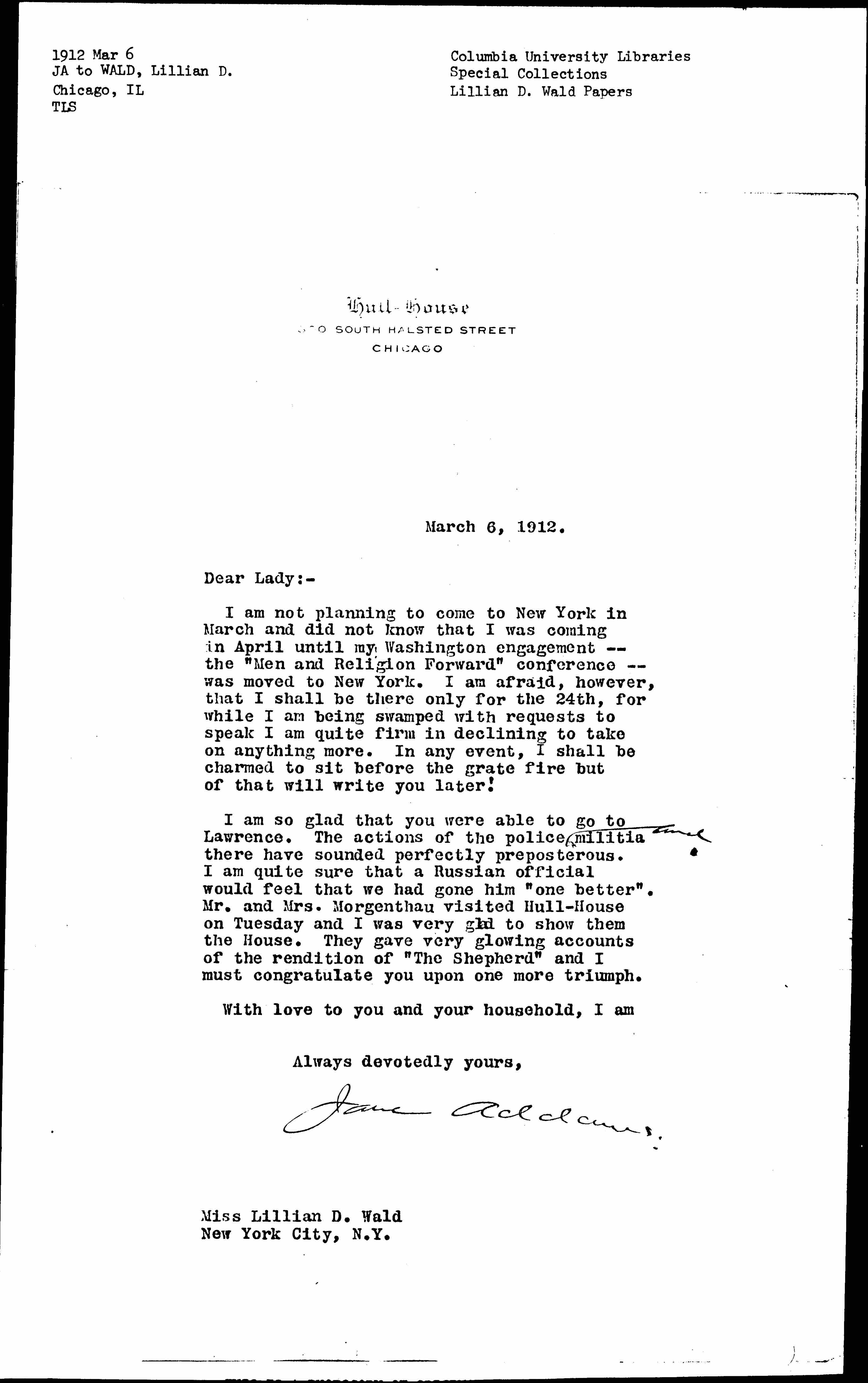 I am so glad that you were able to go to Lawrence. The actions of the police <and> militia there have sounded perfectly preposterous. I am quite sure that a Russian official would feel that we had gone him "one better". Mr. and Mrs. Morgenthau visited Hull-House on Tuesday and I was very glad to show them the House. They gave very glowing accounts of the rendition of "The Shepherd" and I must congratulate you upon one more triumph.