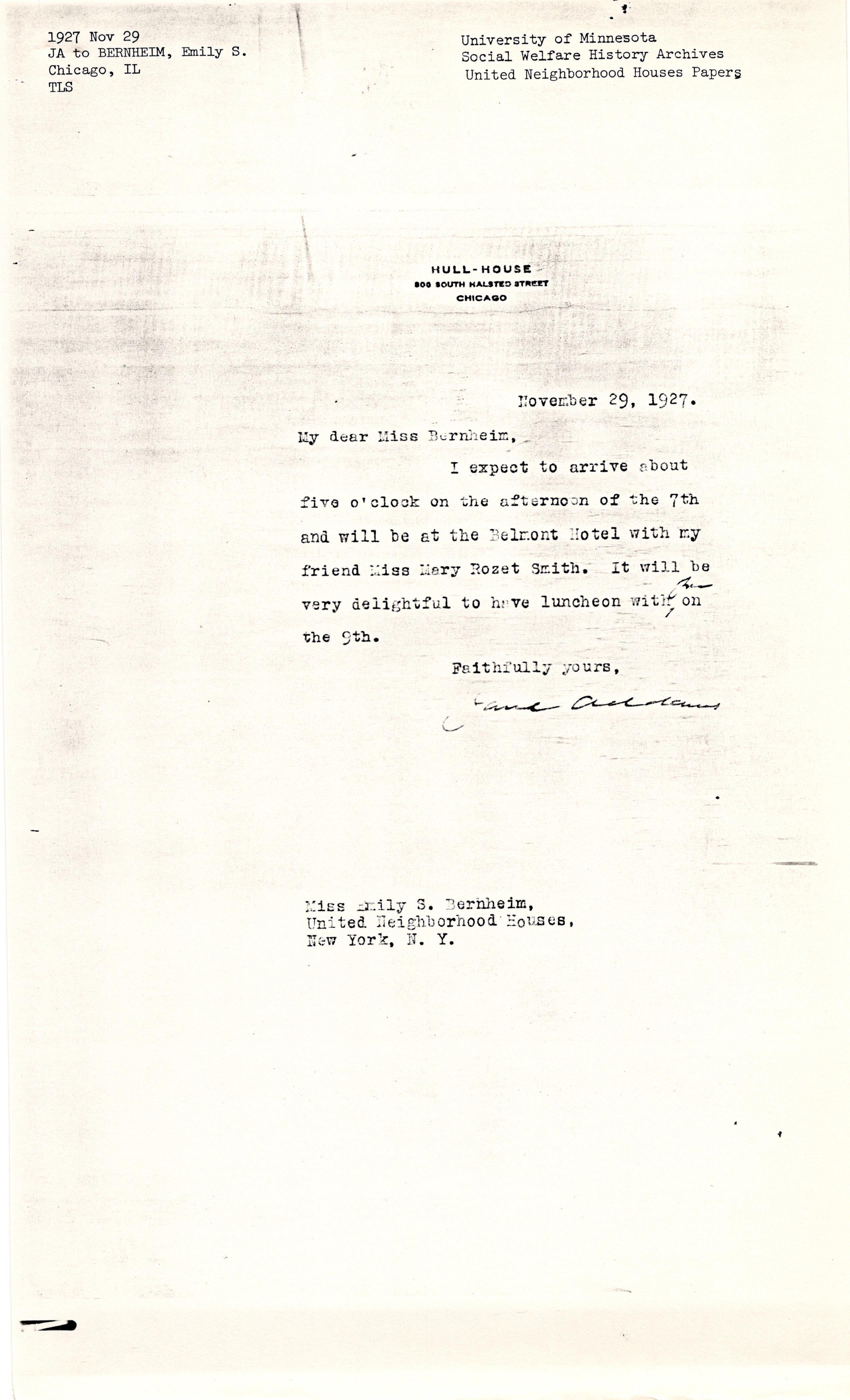 Jane Addams to Emily Stern Bernheim, November 29, 1927