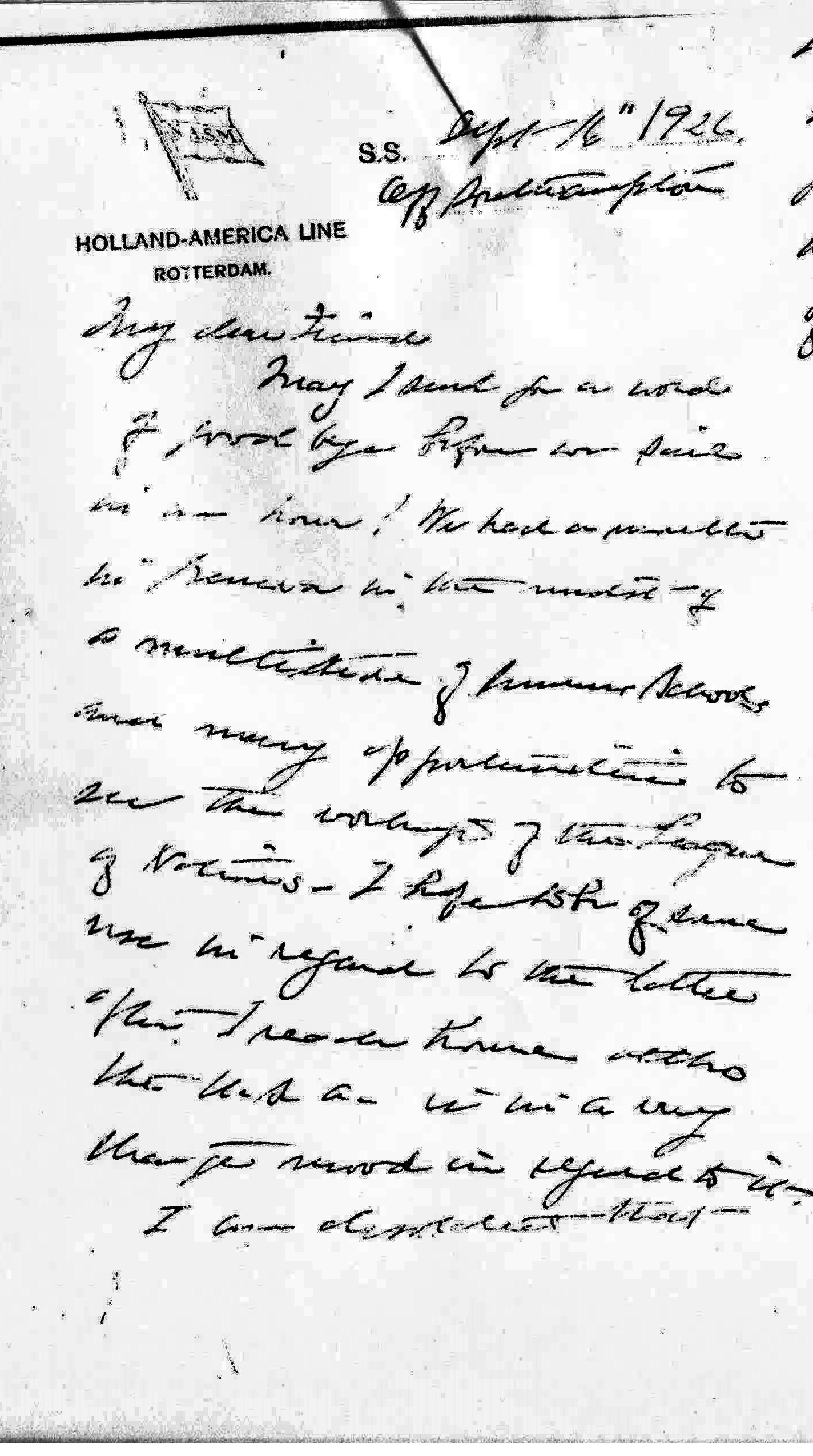May I send you a word of good bye before we sail in an hour? We had a month in Geneva in the midst of a multitude of Summer Schools and many appointments to see the workings of the League of Nations. I hope to be of some use in regard to the latter after I reach home [although] the U.S.A is in a very strange mood in regard to it.