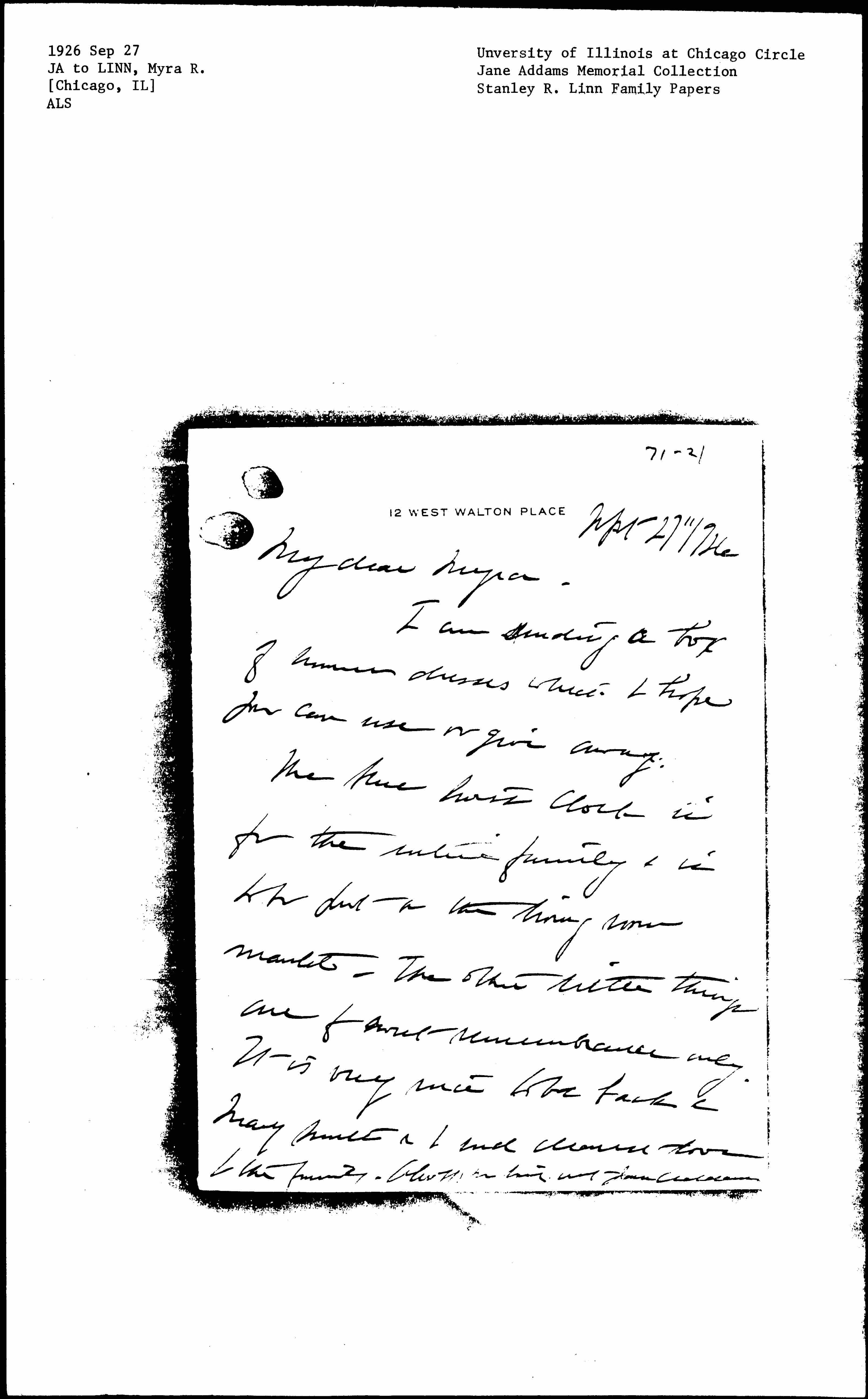 The [blue?] Swiss clock is for the entire family & is to be put on the living room mantle. The other little things are for sweet remembrance only. It is very nice to be back & Mary Smith & and I send dearest love to the family. Always your loving aunt Jane Addams