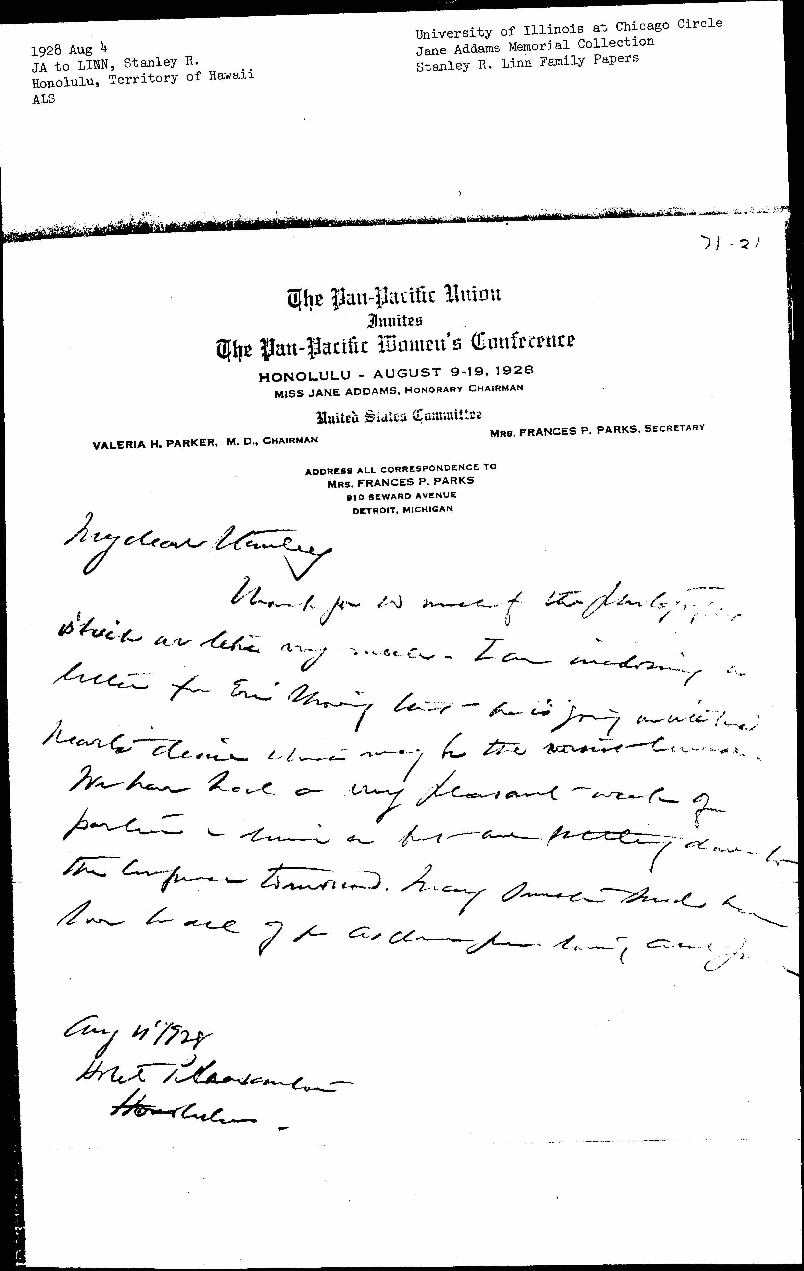 Jane Addams to Stanley Ross Linn, August 4, 1928