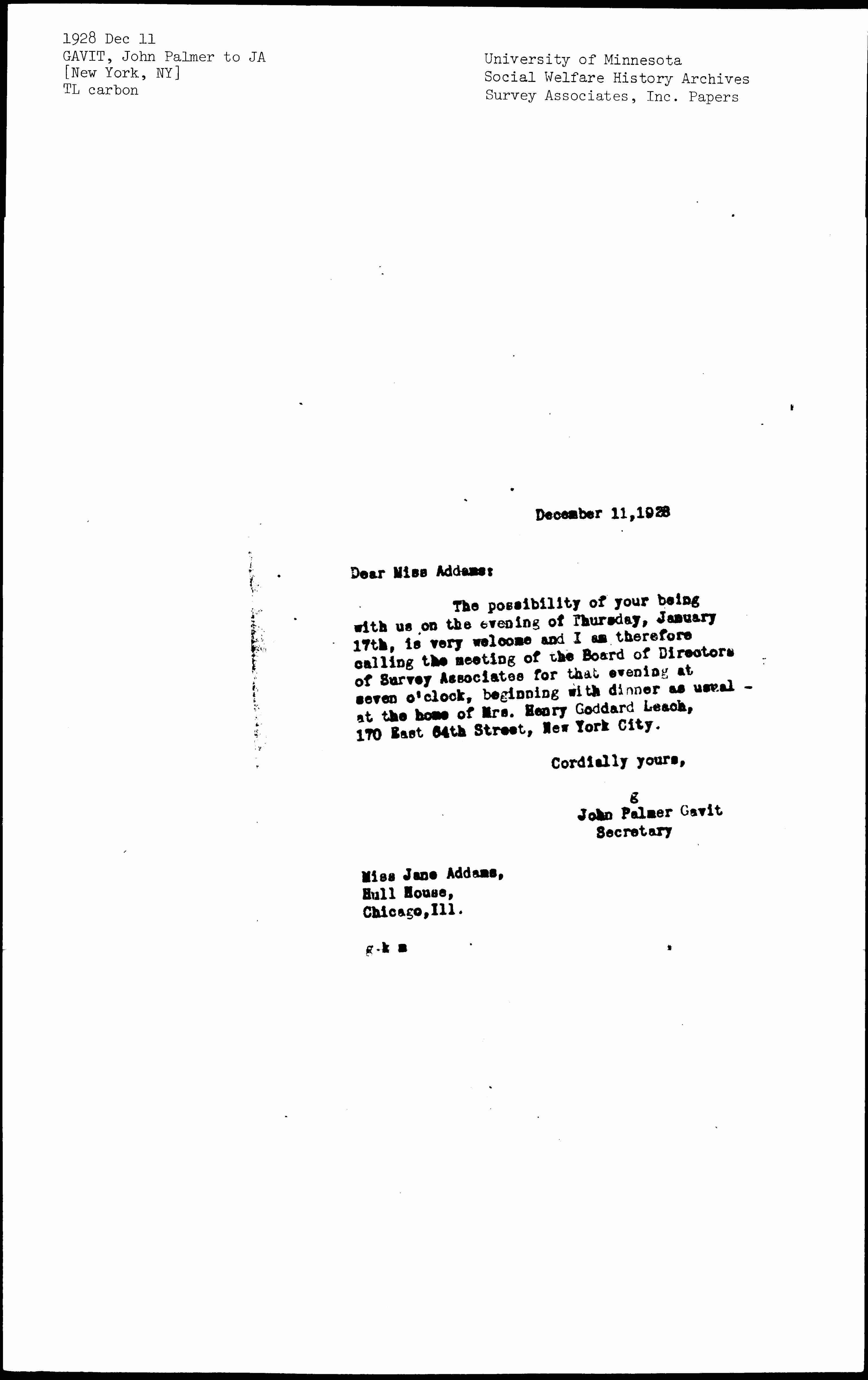John Palmer Gavit to Jane Addams, December 11, 1928