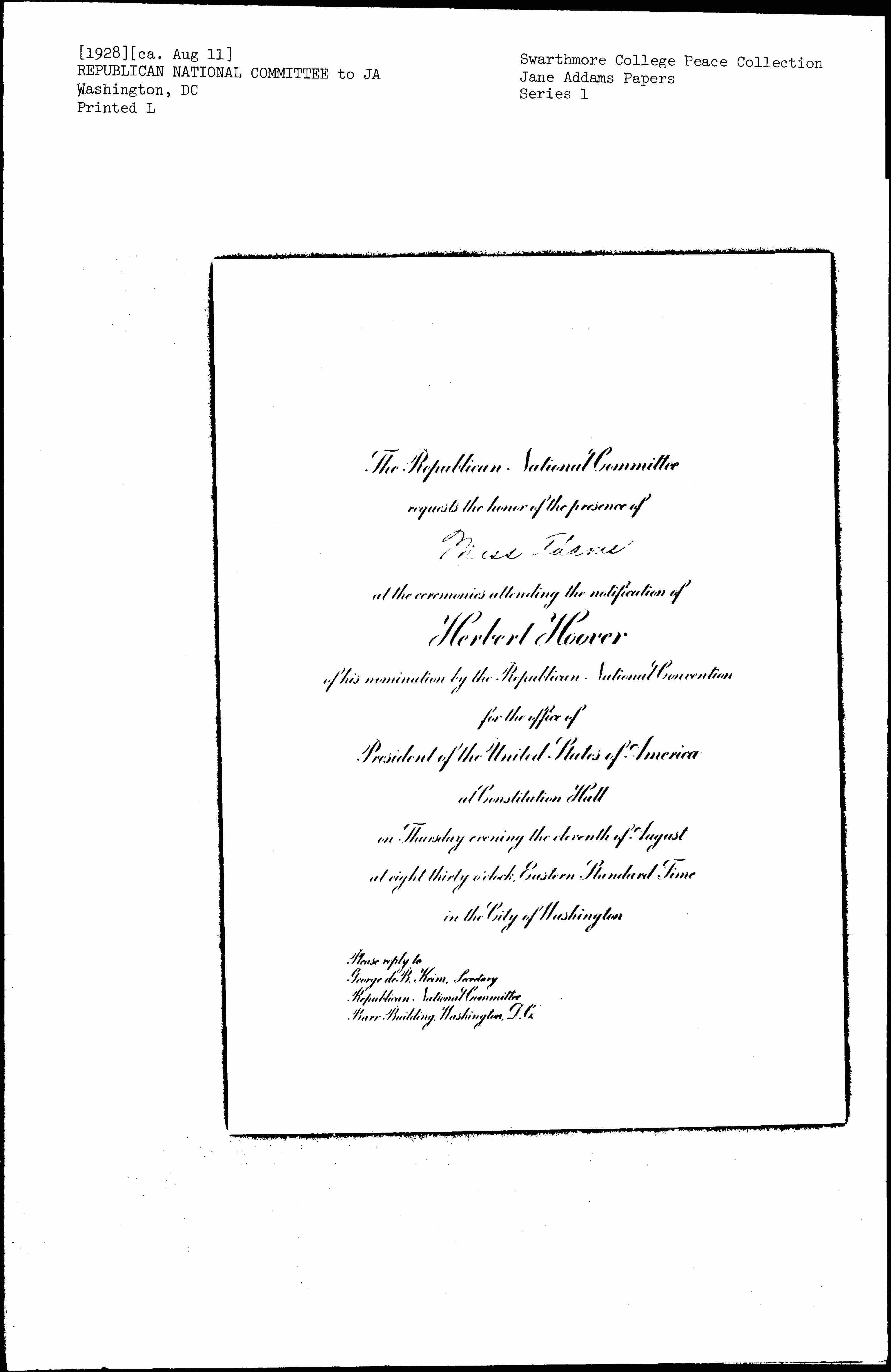 Invitation to the Republican National Convention Nomination of Herbert Hoover, August 1928
