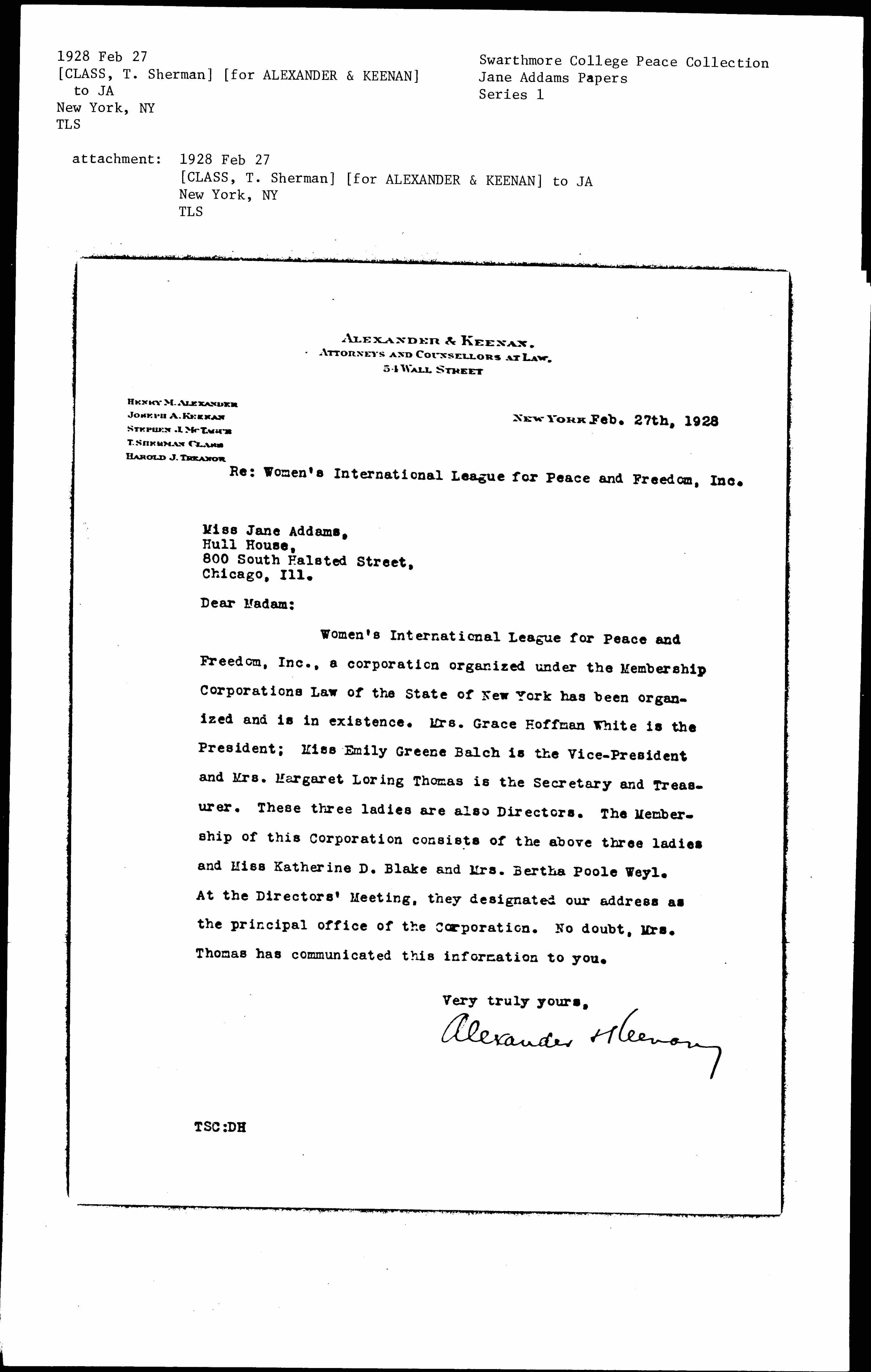 Theodore Sherman Class to Jane Addams, February 27, 1928