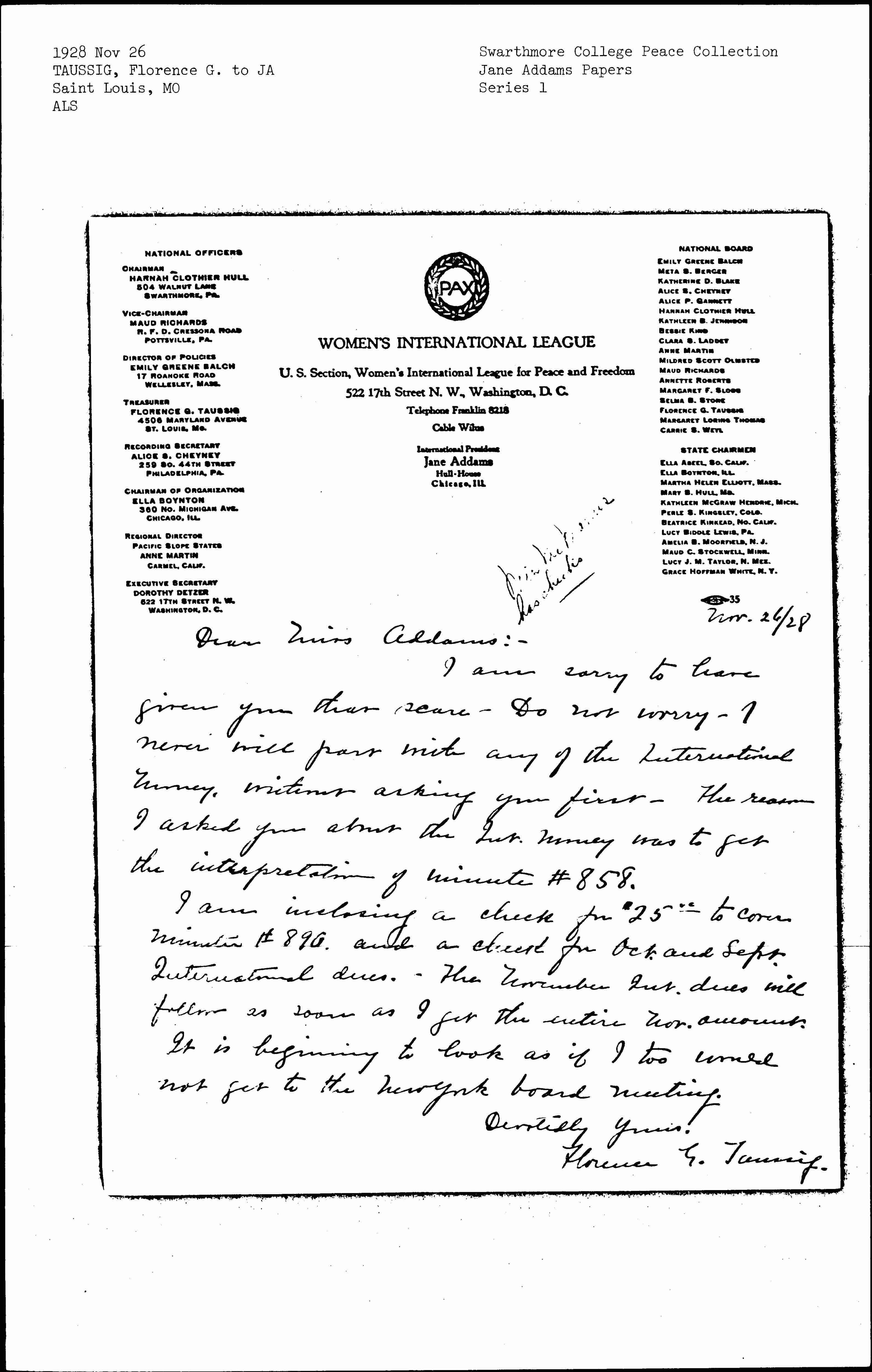 Florence Gottschalk Taussig to Jane Addams, November 26, 1928