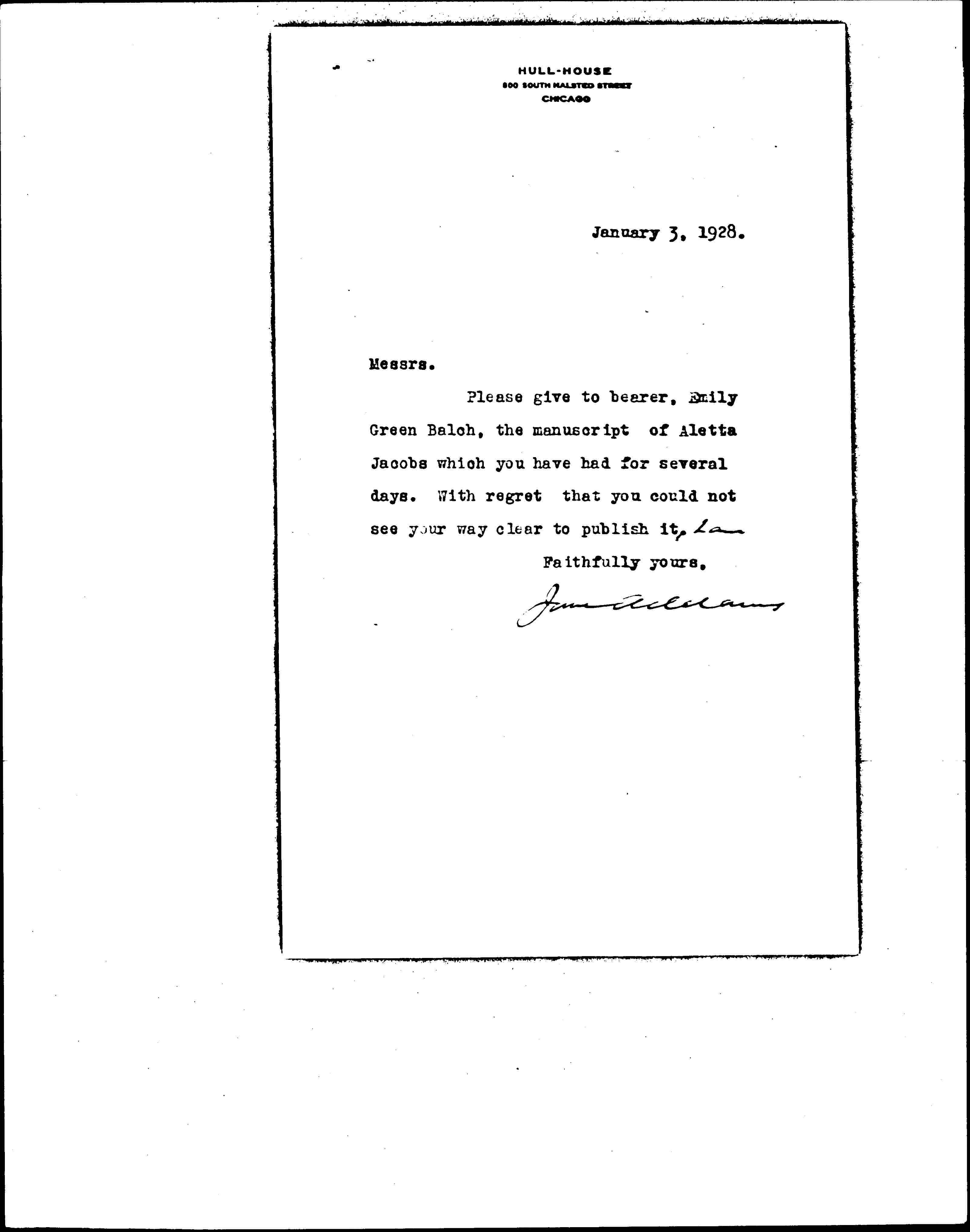 Jane Addams to Thomas Seltzer, Inc., January 3, 1928