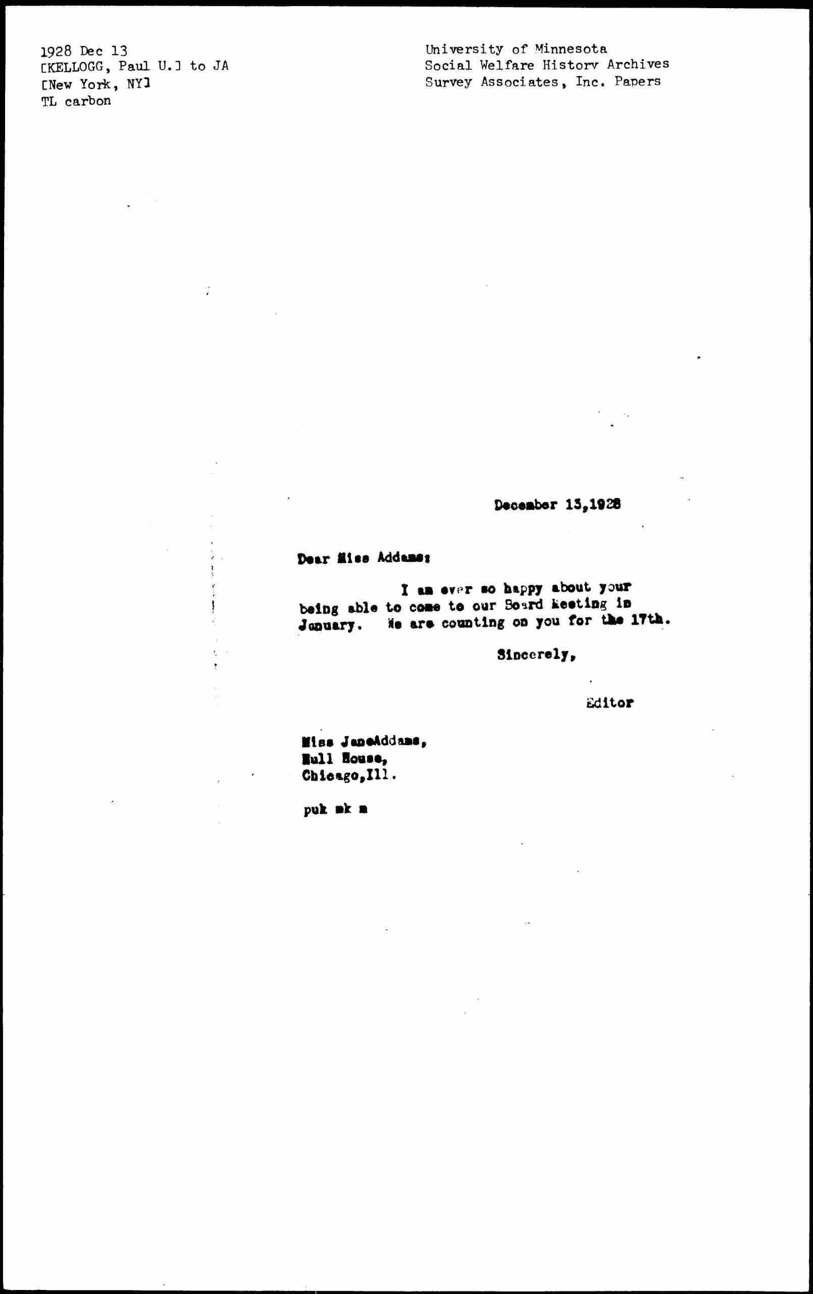Paul Underwood Kellogg to Jane Addams, December 13, 1928