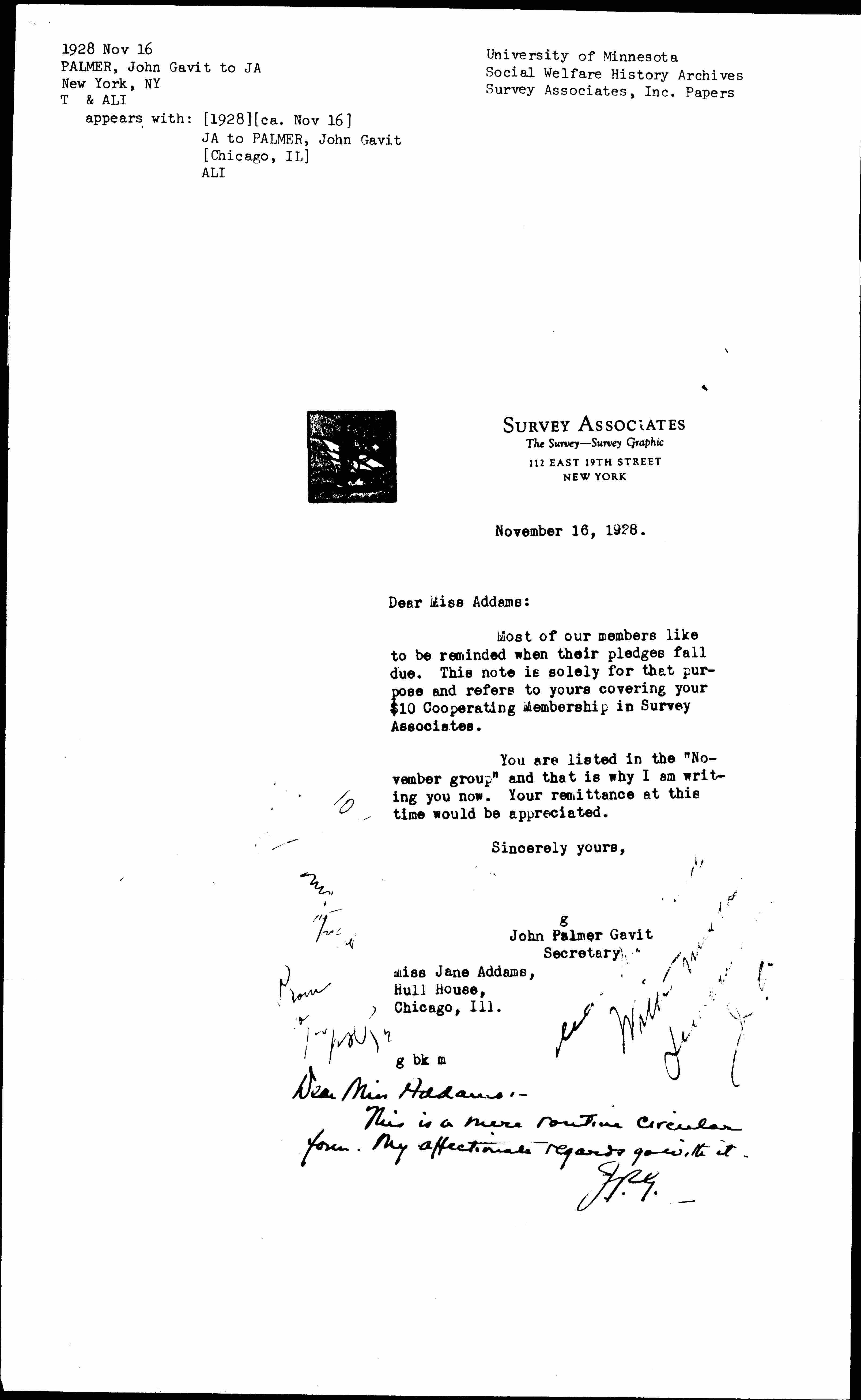 John Palmer Gavit to Jane Addams, November 16, 1928