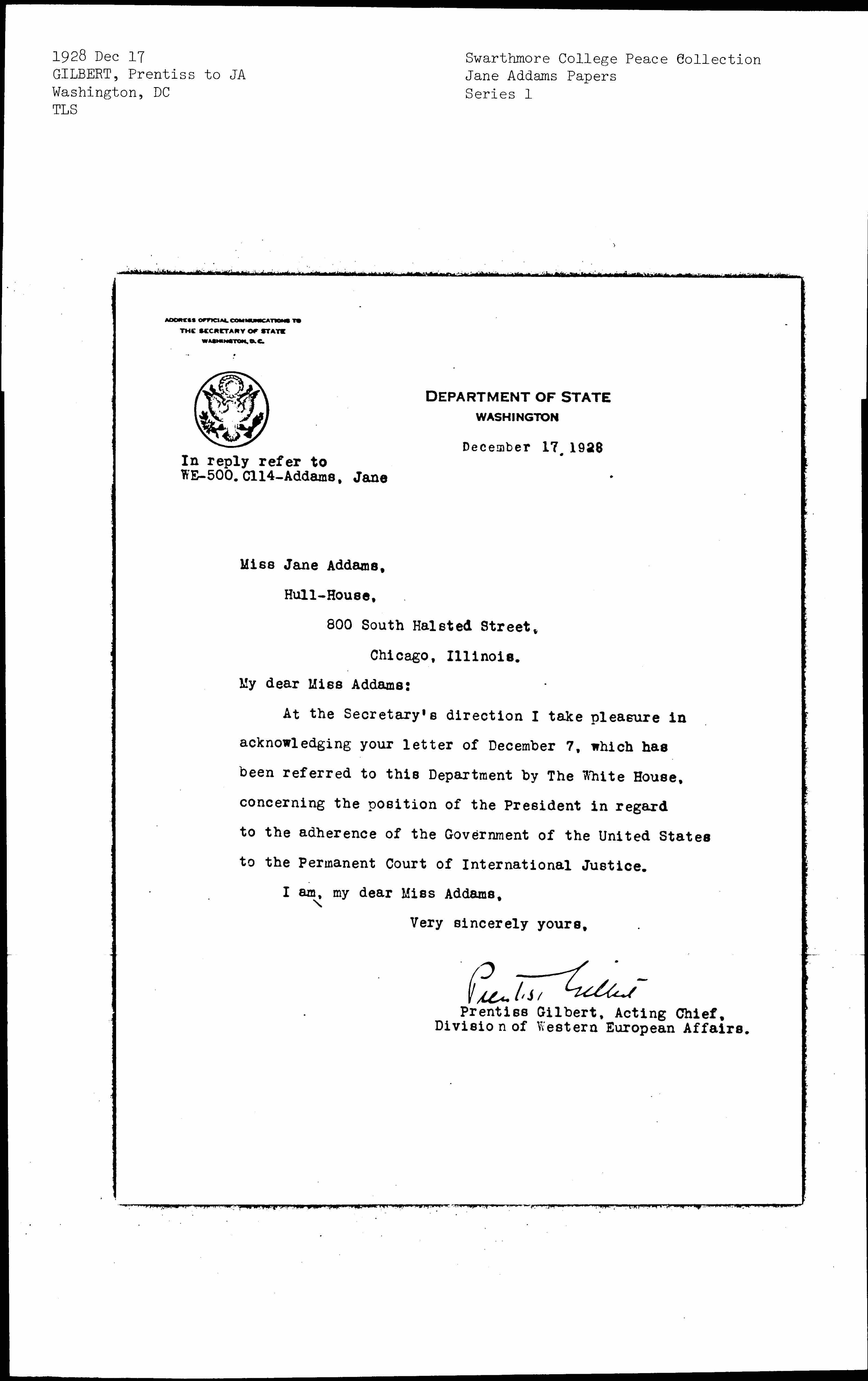 Prentiss Bailey Gilbert to Jane Addams, December 17, 1928
