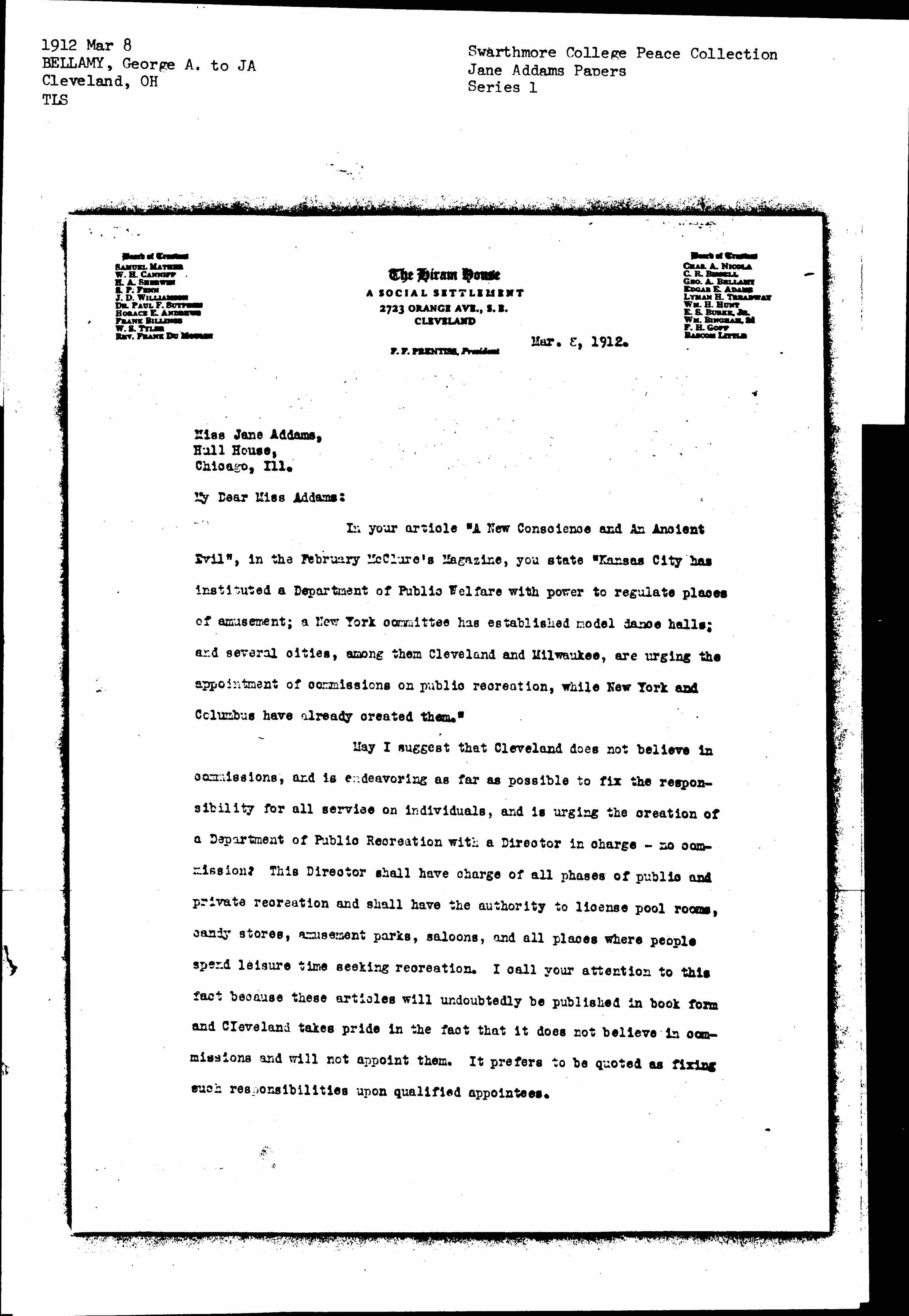 May I suggest that Cleveland does not believe in commissions, and is endeavoring as far as possible to fix the responsibility for all service on individuals, and is urging the creation of a Department of Public Recreation with a Director in charge -- no commission? This Director shall have charge of all phases of public and private recreation and shall have the authority to license pool rooms, candy stores, amusement parks, saloons, and all places where people spend leisure time seeking recreation. I call your attention to this fact because these articles will undoubtedly be published in book form and Cleveland takes pride in the fact that it does not believe in commissions and will not appoint them. It prefers to be quoted as fixing such responsibilities upon qualified appointees. [page 2]
