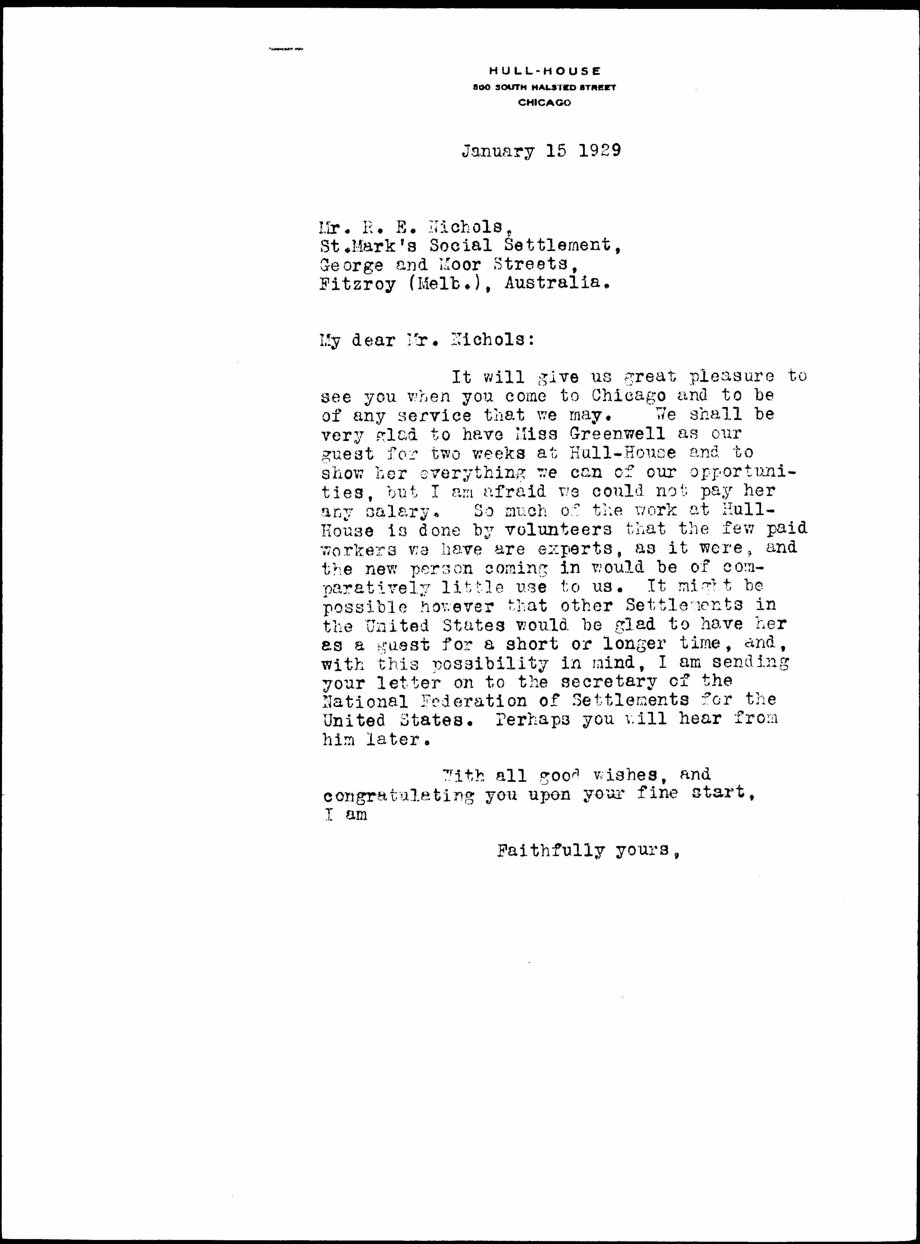 Jane Addams to Reginald Gordon Nichols, January 15, 1929