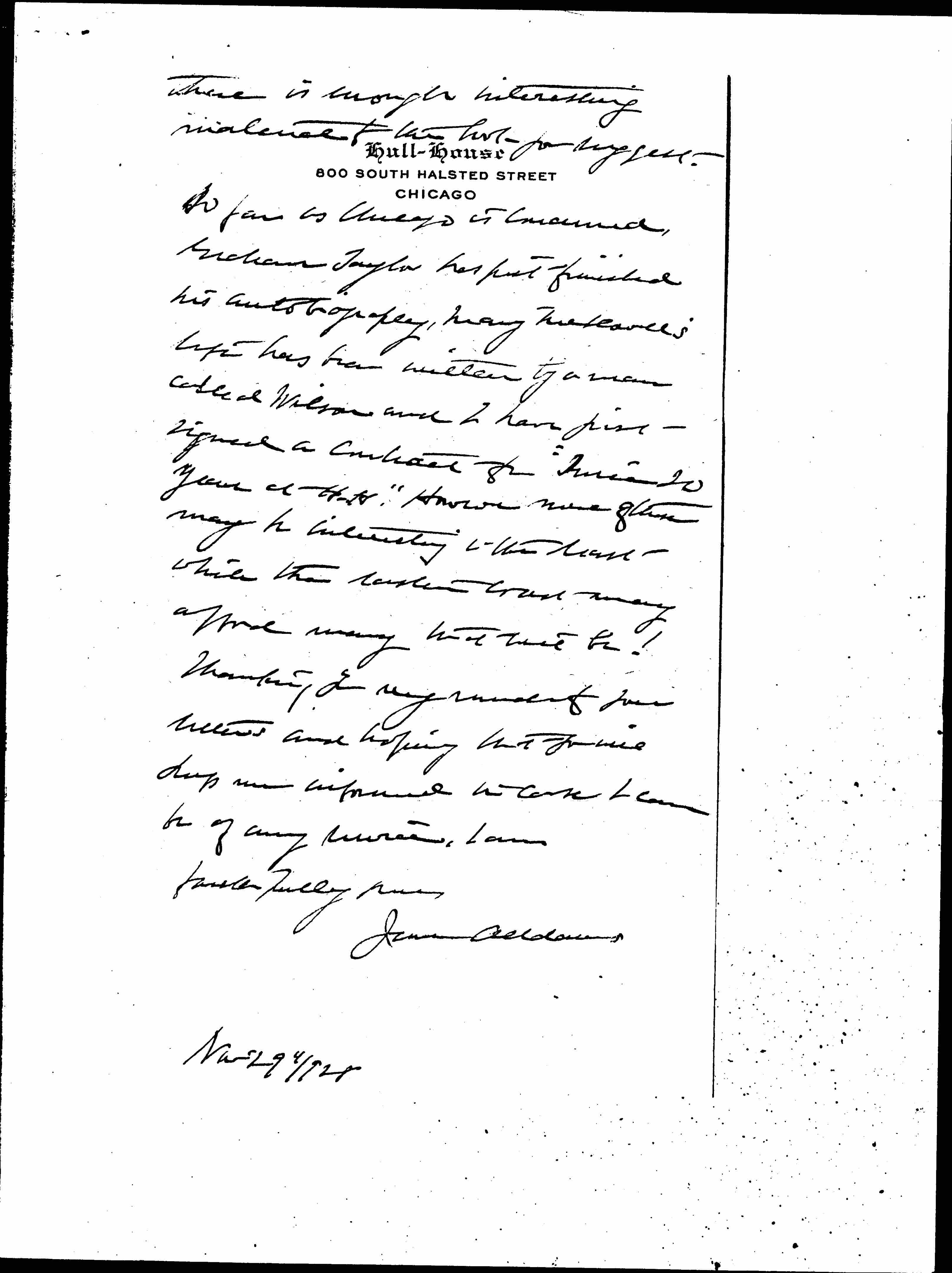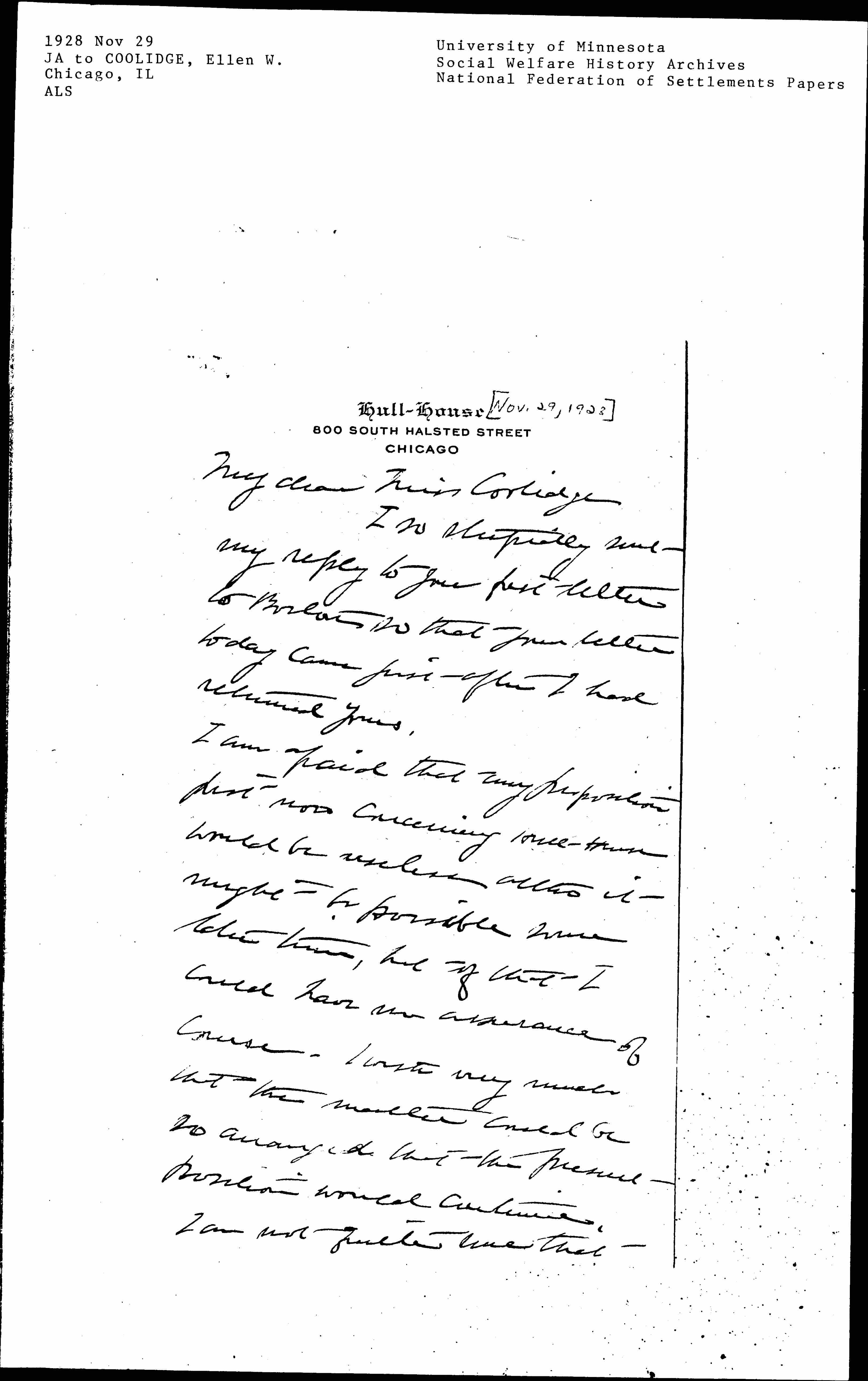 Jane Addams to Ellen Wayles Coolidge, November 29, 1928