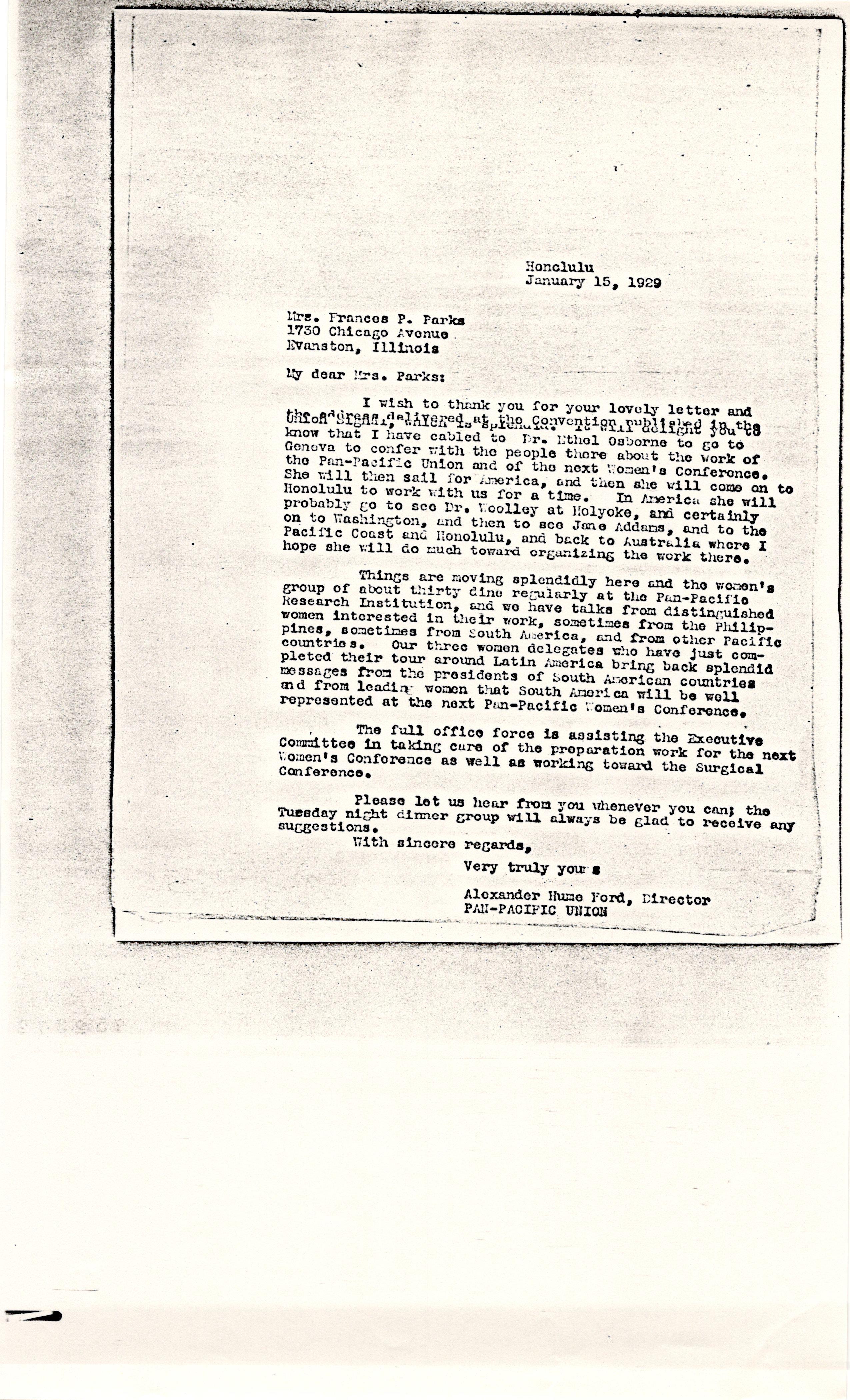 Alexander Hume Ford to Frances Spaeth Parks, January 15, 1929
