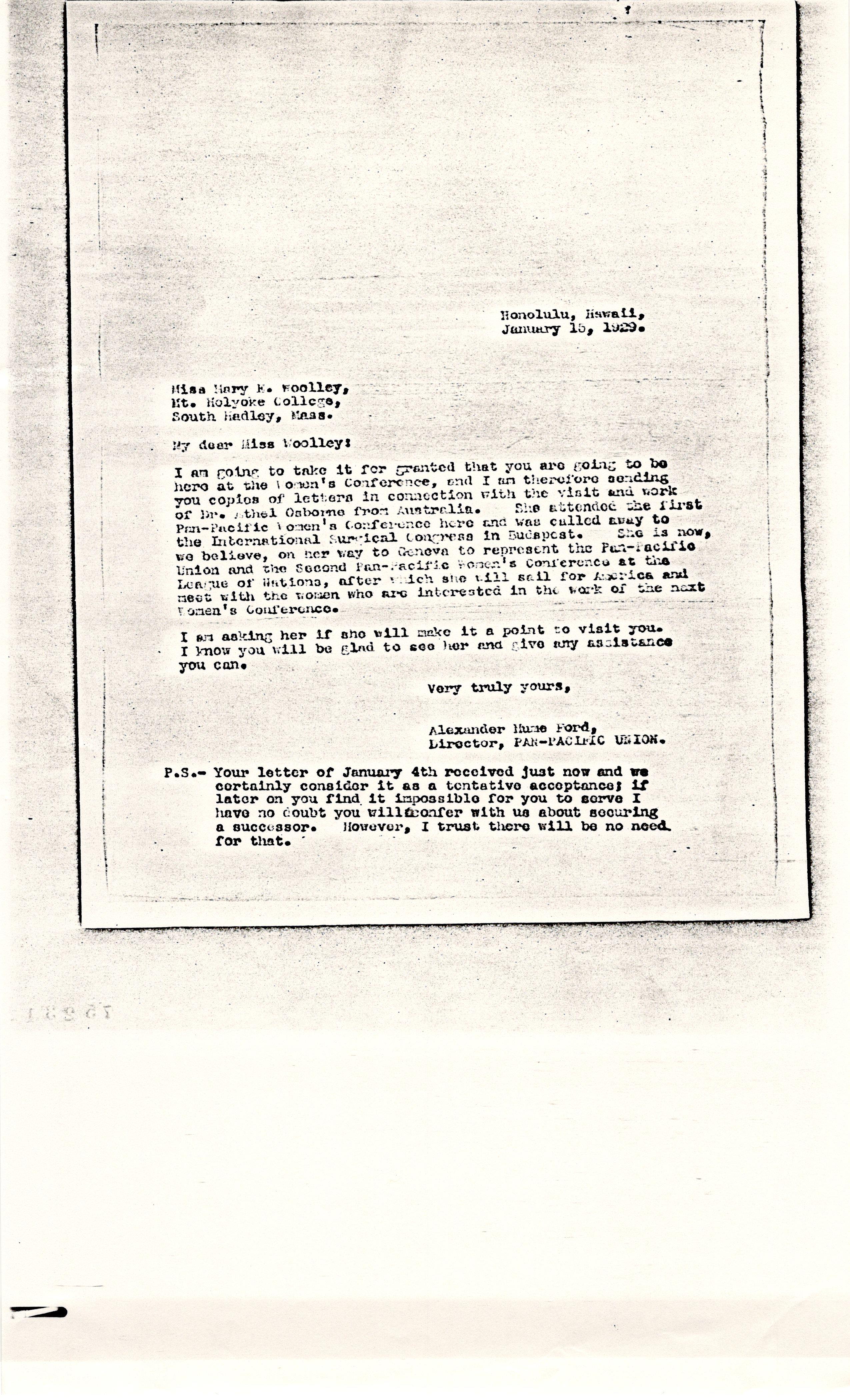 Alexander Hume Ford to Mary Emma Woolley, January 15, 1929
