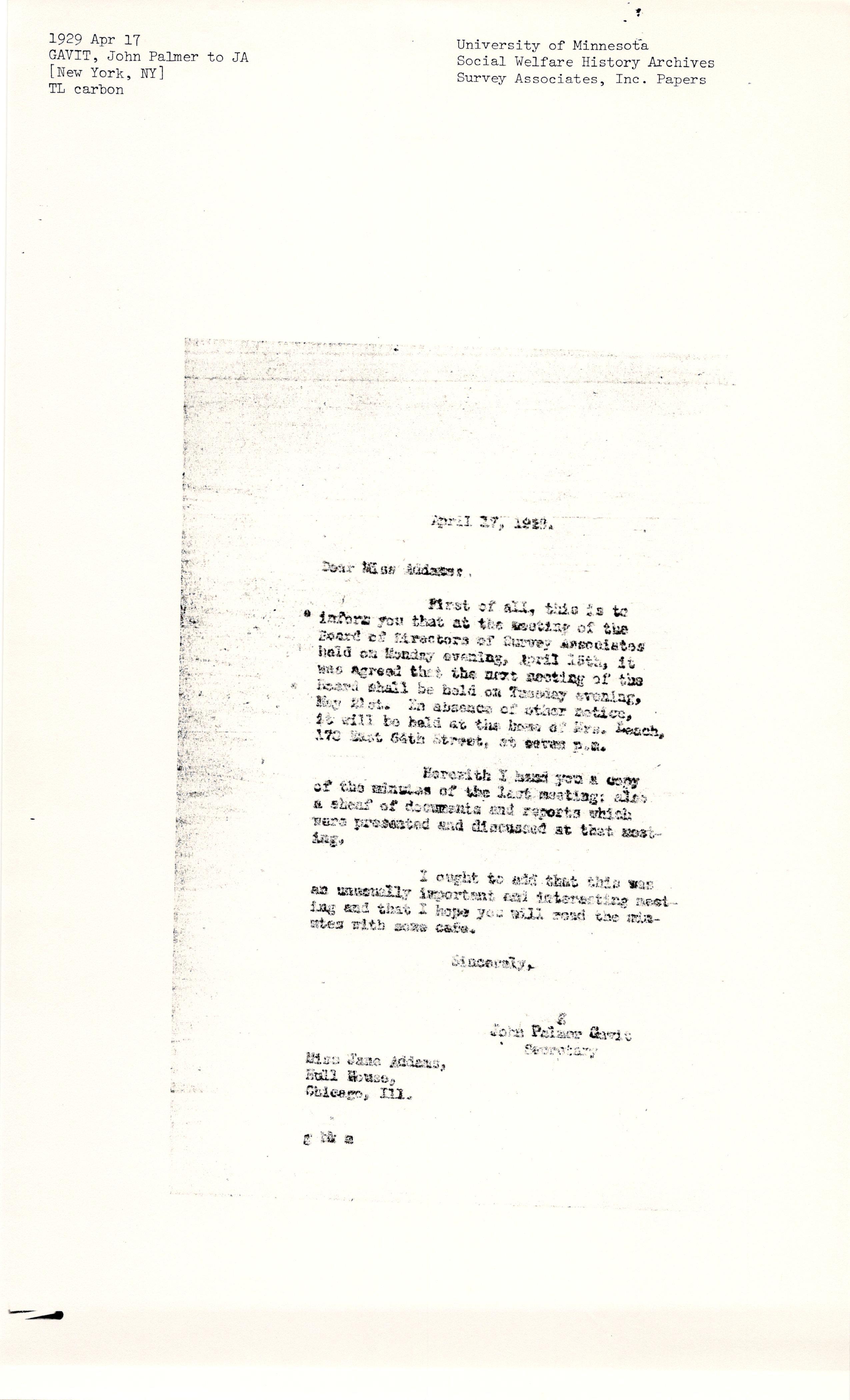 John Palmer Gavit to Jane Addams, April 17, 1929
