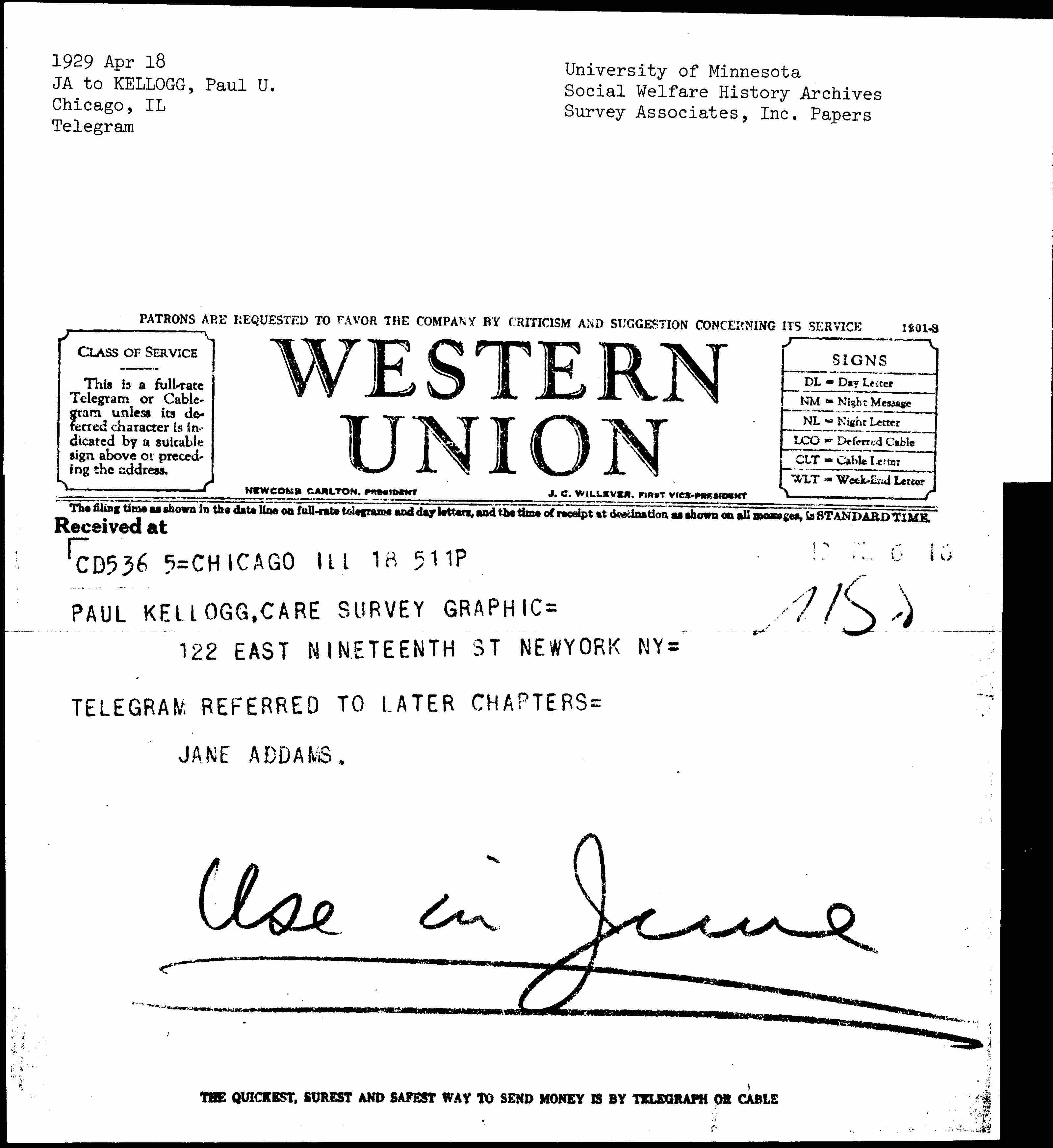 Paul Underwood Kellogg to Jane Addams, April 16, 1929