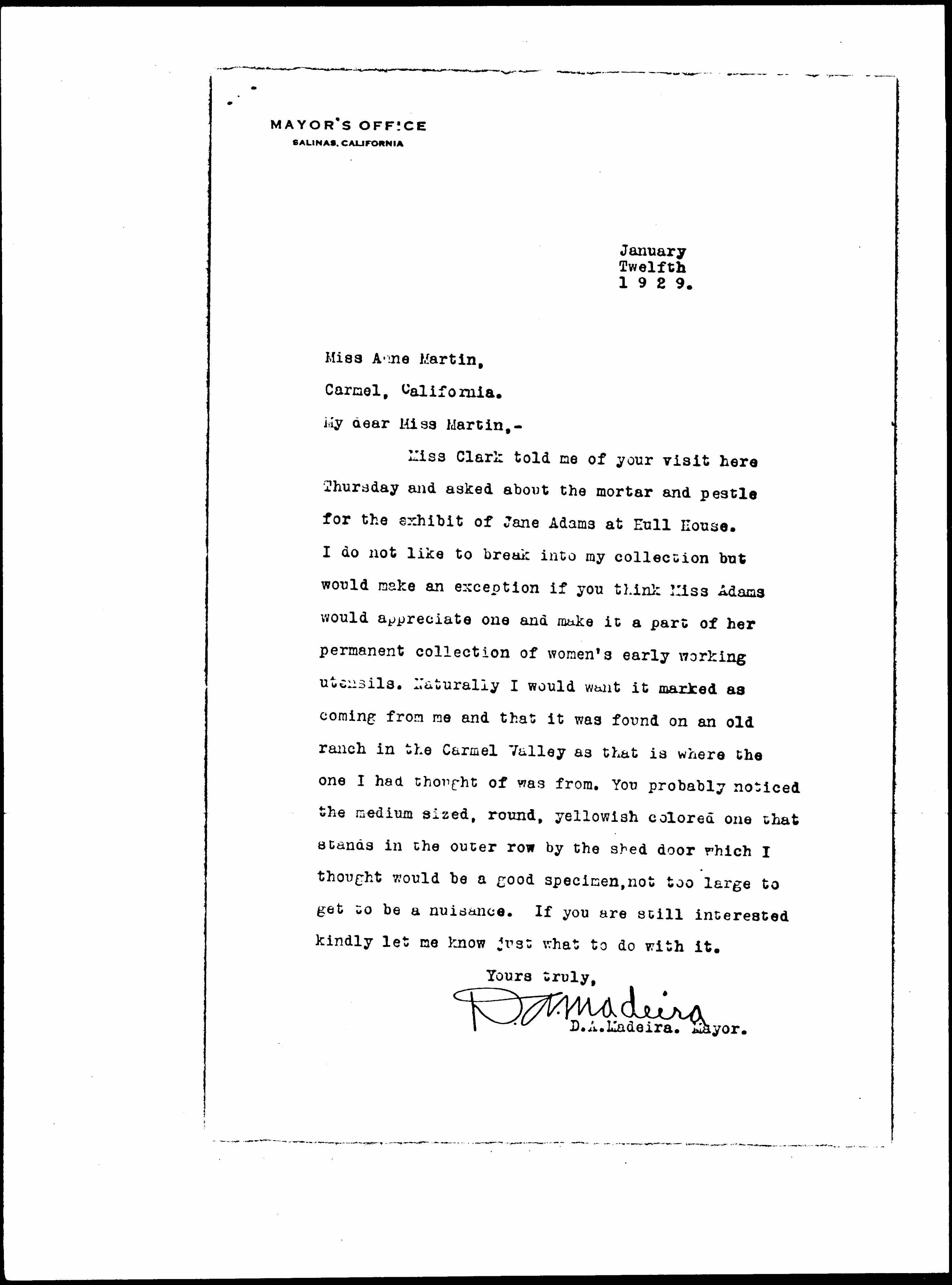 Daniel Arthur Madeira to Anne Henrietta Martin, January 12, 1929