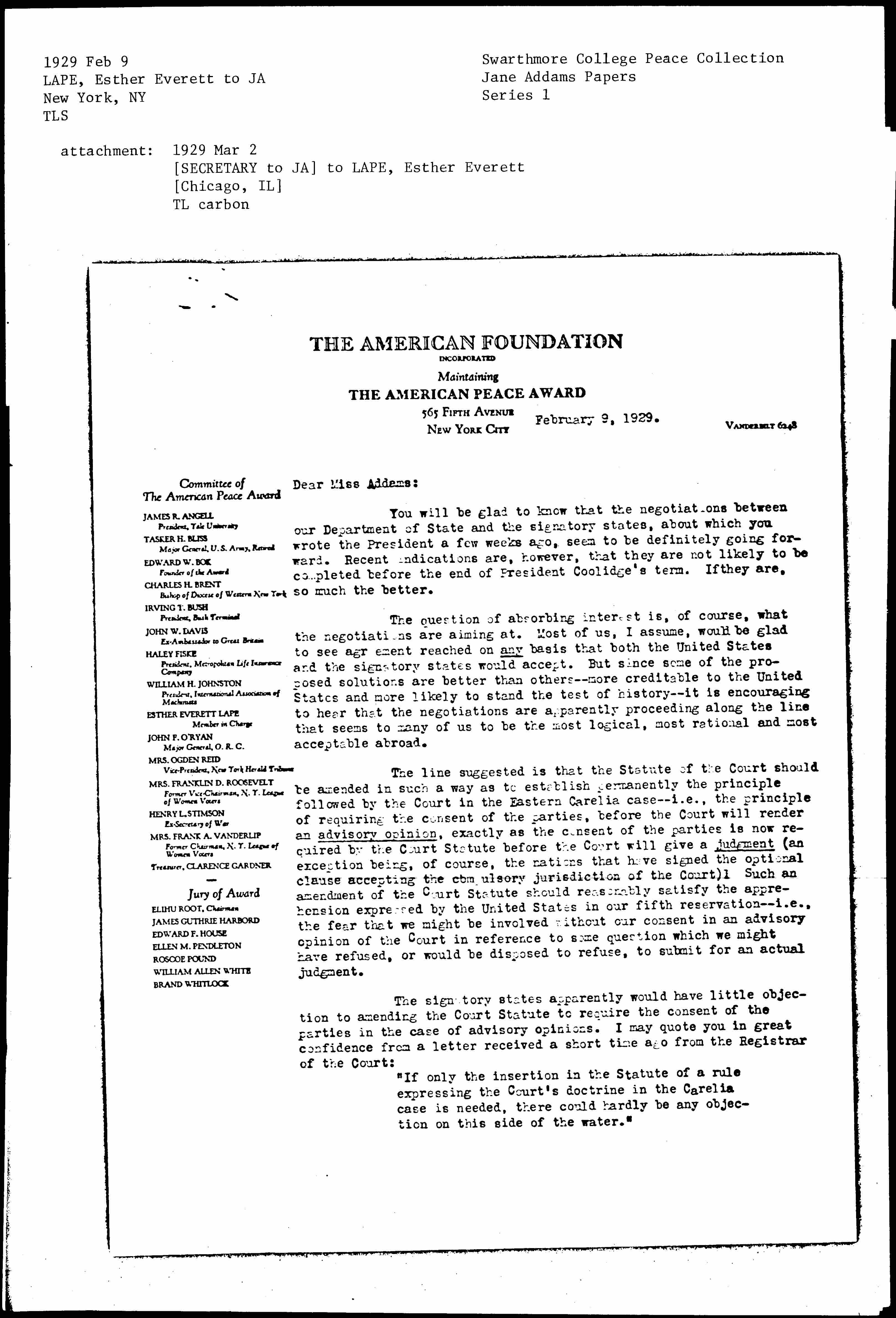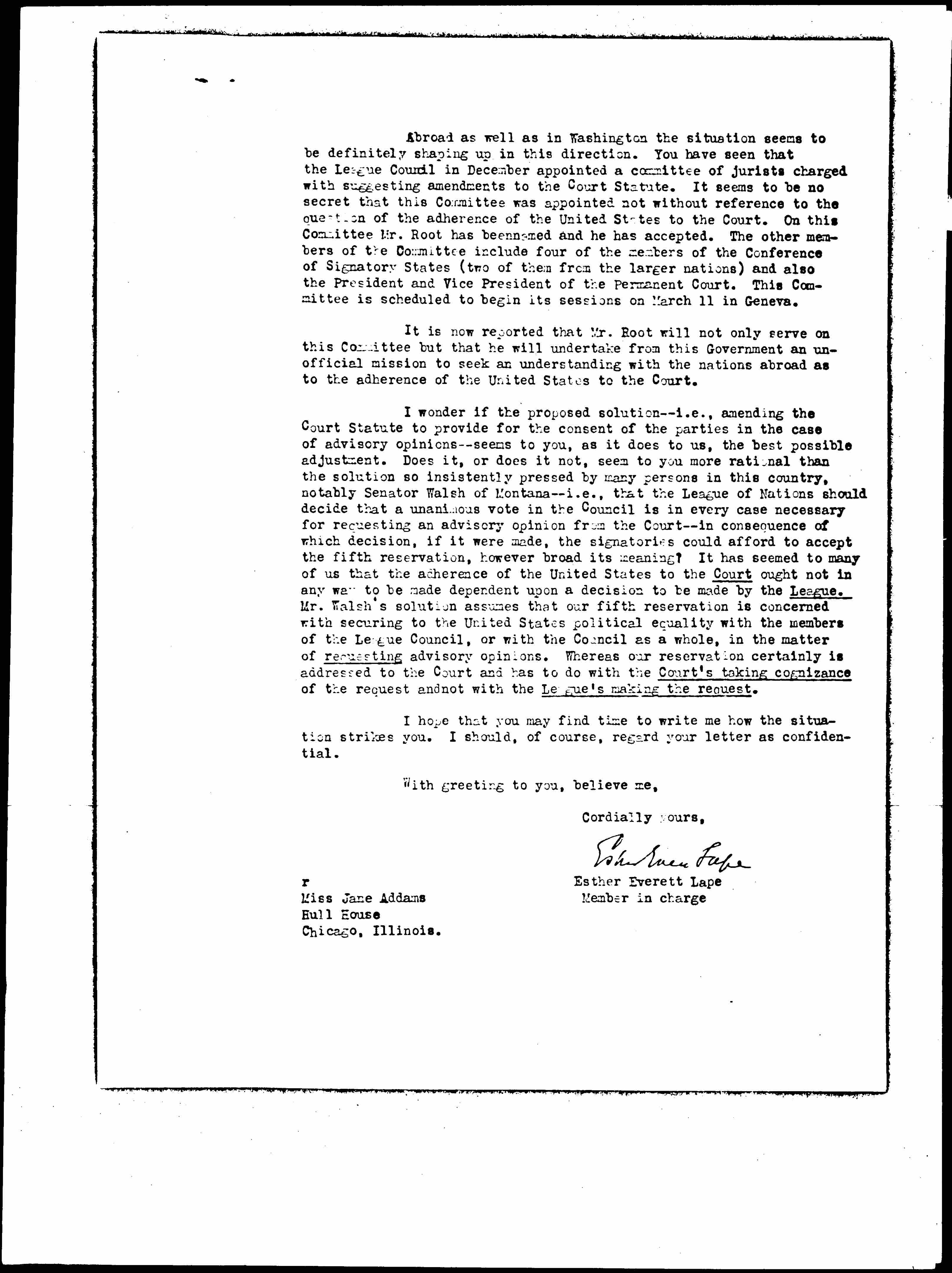 Jane Addams to Esther Everett Lape, March 2, 1929